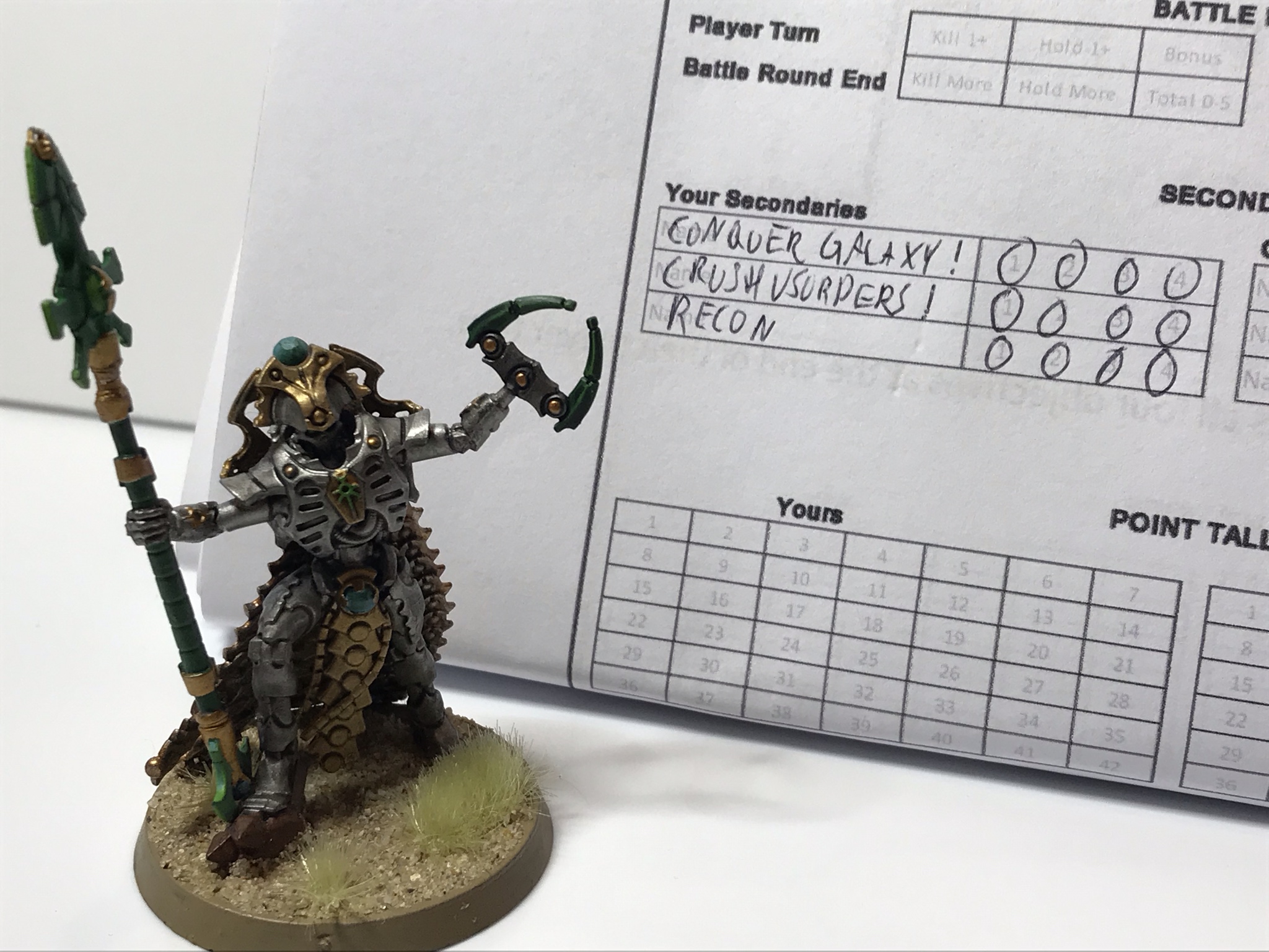 Combining these should give you the tools you need to make sensible choices in your future games, and hopefully dispel some of the mystique around the process. It's also important to stress that it's fine to get this wrong sometimes - even the best players make mistakes on this, and I've certainly come away from all my recent events with at least one game where I think I made the wrong choice - a Necrons vs. Orks match where I had to make serious sacrifices to score my last Recon point but had scythed (well, 3 "wraithed" and one "scythed") through four characters by turn 3 springs especially to mind. It's also worth mentioning that in every ITC mission there's 42 points available, and only 12 of them are from secondaries. It's a common error for players new to ITC to get overexcited about picking secondaries and focusing on those, and then forget that 70% of the points available come from the primary mission. Choosing good secondaries will