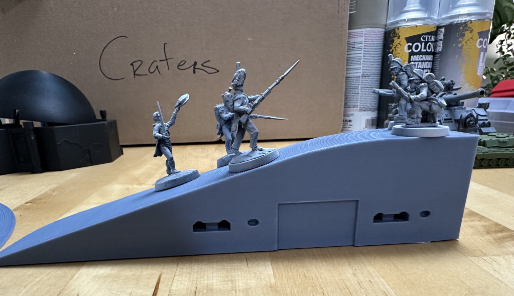 That slope you're looking at in the image above is about a 35% grade, or a 20 degree incline. That is more or less the maximum steepness you can get away with before your minis either slide or tumble down a slope, and even then you'll want to give them help staying on the hill - texturing the surface with flock and grit, or in the case of the above hill, striations from 3d printing, can give your minis' bases something to cling to and keep them from toppling over or just sliding back down. My recommendation is to start with textured paint and add flock and other basing elements to give units something to grip.