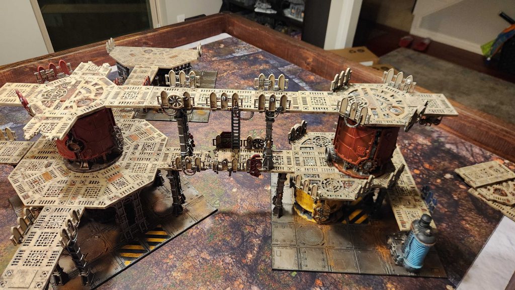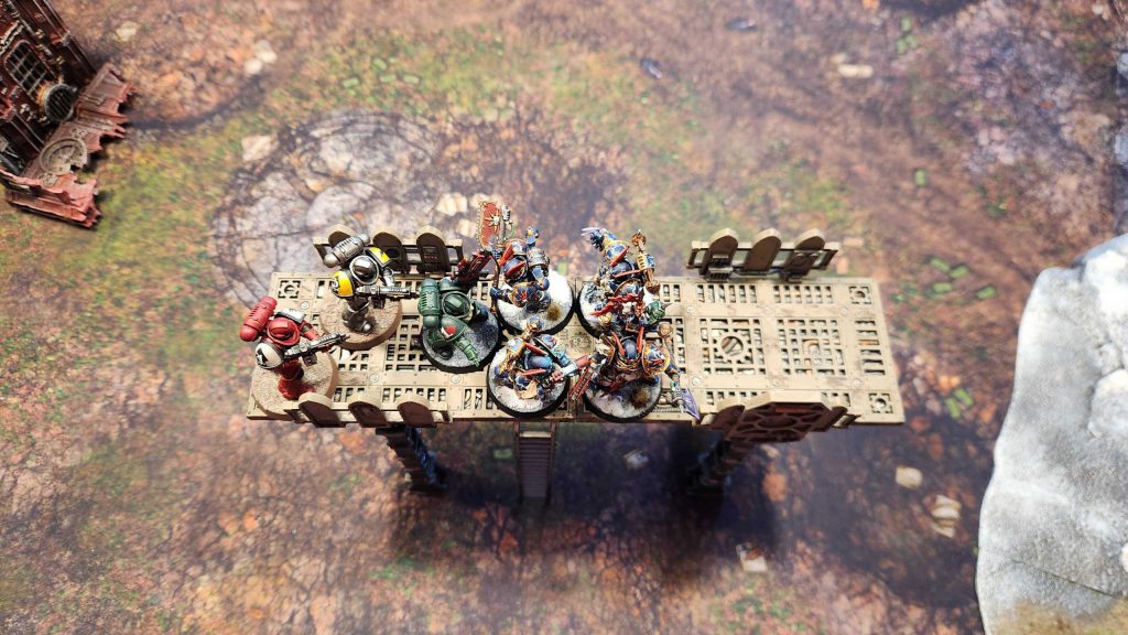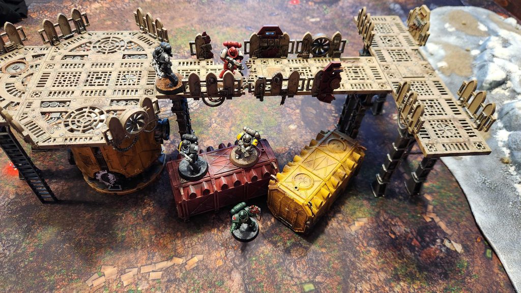 On the walkway up above we can see the issue - the walkways aren't wide enough for units to walk past each other and if they want to fight, you can fit at most two models side by side, meaning only four models can fight in any combat - and that's if you're on 32mm bases or smaller. Models on 40mm bases can only fit in a single file line on that walkway.