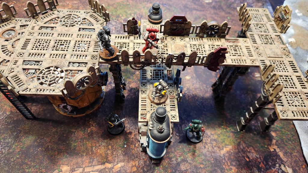 On top of those five issues, we also have to account for the rules in tenth edition 40k, which give models a 5" vertical engagement range. this means that any catwalk or platform positioned 5" or less in height over the battlefield or another floor will create an impassible engagement range for models moving underneath. In the image below, these two combatants are locked in mortal combat with each other despite being separated by the gantry and several inches.