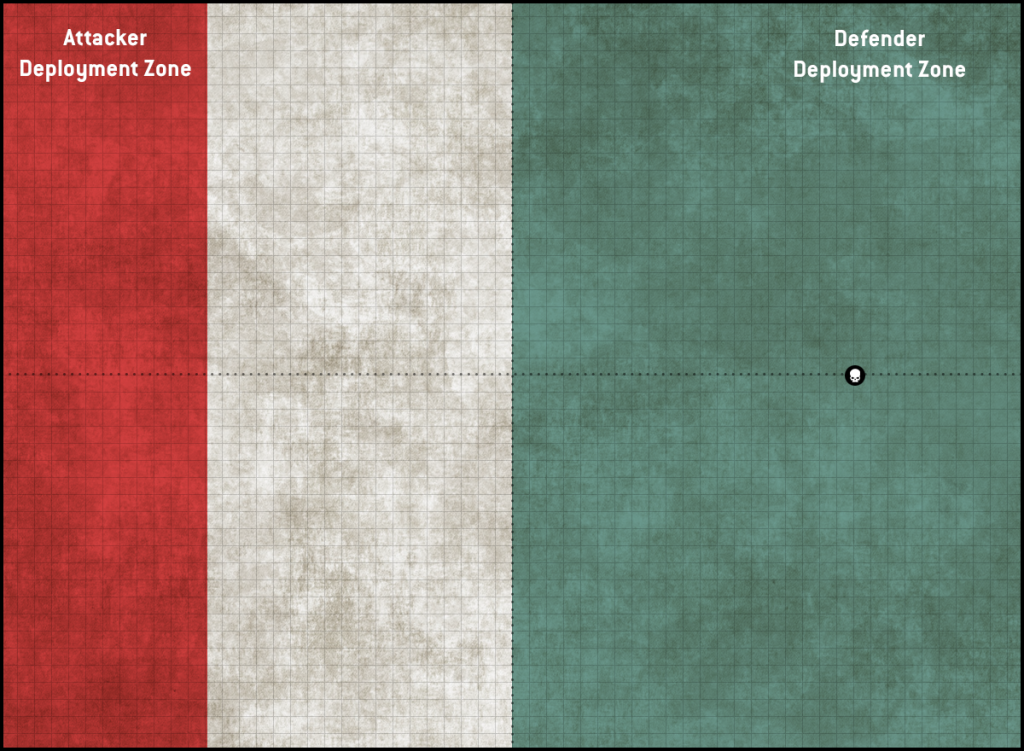 I'd likely have the Attackers going first here, and the Defenders can choose which of the two lines (or both) they want to populate, with the bastion in the back acting as a second fortification. The forest and two ruin bases give slower units somewhere to hide before they try and cross the middle of the table, but the general idea is that the Attacker has more to work with and