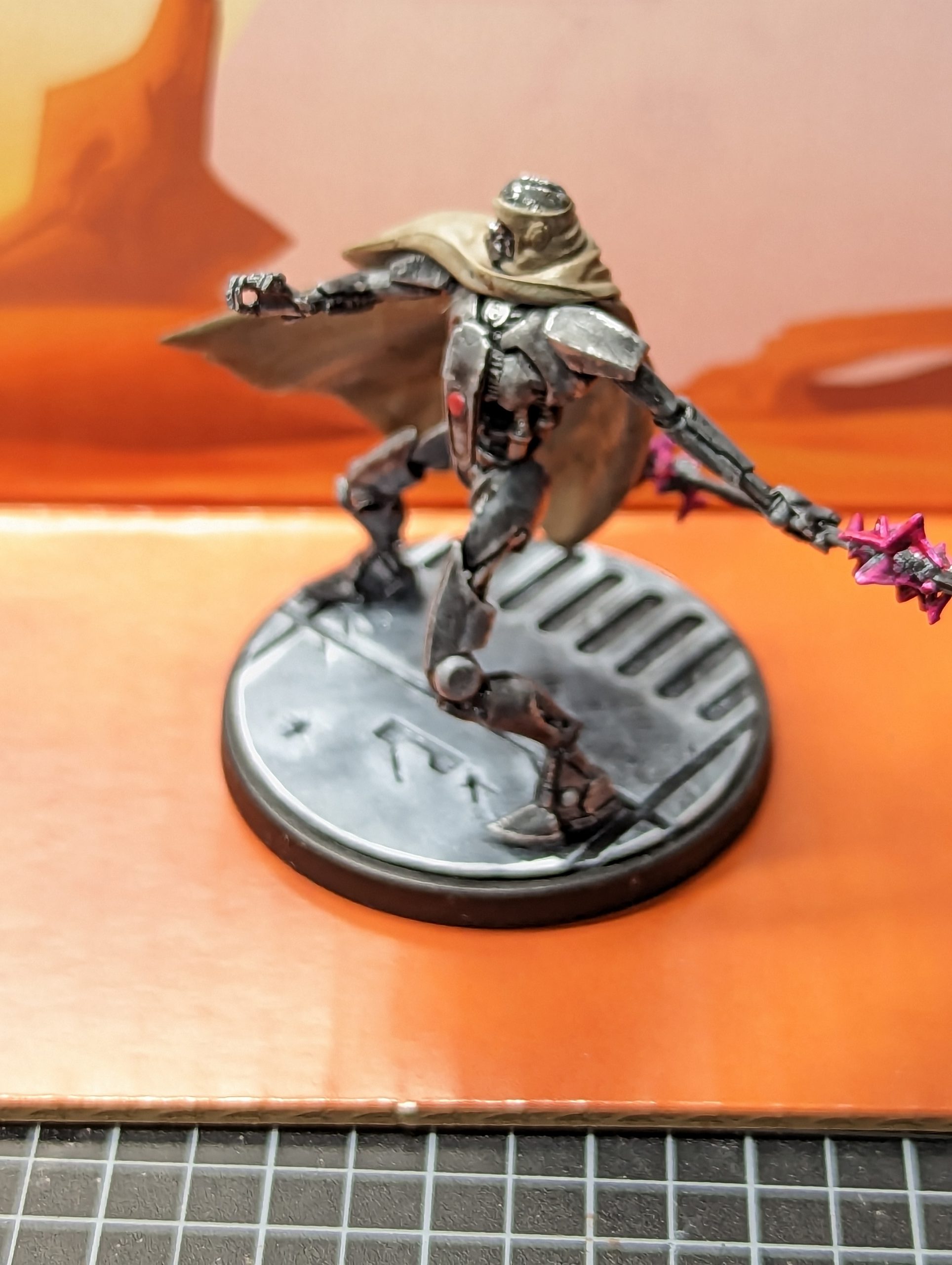 Once this had been done I gave the model a coat of gloss varnish and then pinwashed a number of the seams on the model to give even more definition to the various plates and edges. I did the cloak in a few thin coats of Rakarth Flesh with a wash of Agrax Earthshade, with an extra bit of wash along the bottom of the cloak to show a build up of dirt from being dragged on the floor.