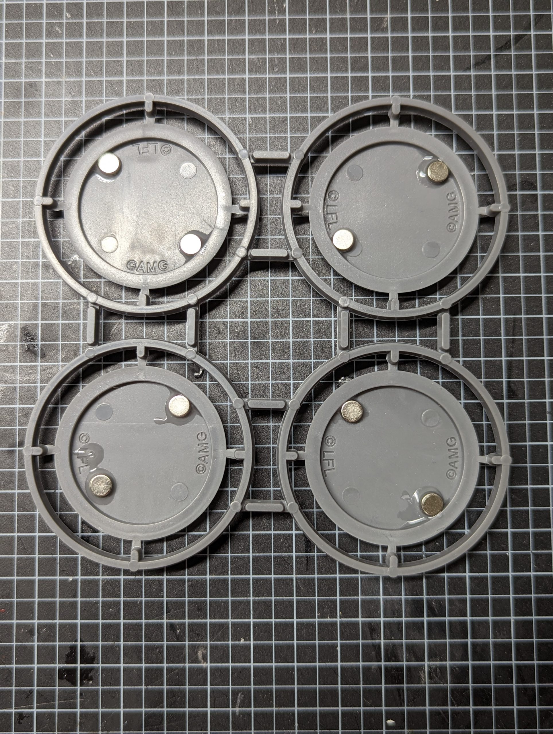 I would highly recommend using either one pretty big magnet or two magnets placed at opposite edges of the base. This prevents models rotating in the box during transport and banging each other. The magnets I used are 2mm by 5mm. I'd also recommend just getting these magnets glued in as soon as you get the box. I've done all the bases in all the sets immediately, so when I get round to doing the other teams the bases are already done. It is a lot fiddlier putting magnets on bases where there is a miniature on it than just gluing them in while it is still on the sprue like this.