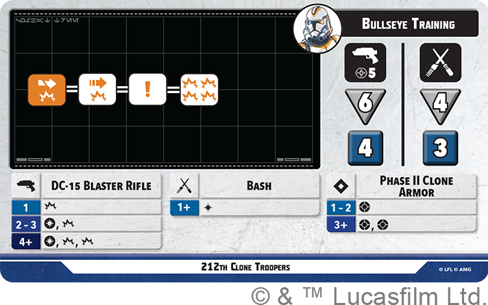 The Stance Card for the 212th, Bullseye Training, is pretty simple. With only 4 tracks on a single branch it's all about doing what you can to get to the end of the track or apply all the effects. In terms of raw damage (not that that's the most important thing) you can apply 8 damage (per clone!) which is really high from a supporting unit. Pin, Shove and Expose are all great effects and being able to apply the Pin and Expose from the first clone ready for the second clones shot is great and gives you a decent chance of getting the 4 damage off the 4th track. Lets just try and make sure they aren't having to fight in close combat though.