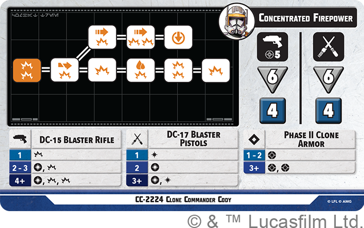 Commander Cody being a secondary unit only has a single stance but it's a decent one. 4 Defence dice and the standard Phase II Clone Armor mean he's not the toughest by himself but with a Hunker Token he's about a resilient to attacks as the offensive stances of the Primary Characters. Offensively you've got an attack starting on 6 dice which you can make up to 9 if the scenario presents itself.