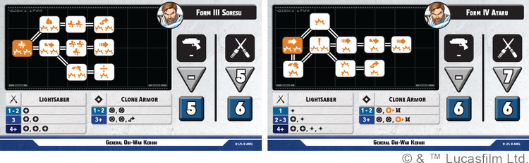 Kenobi's stance cards allow for two different styles. The Form III Soresu is a stance with less dice in offensive and 1 less dice against ranged attacks but has a slightly more reliable expertise tree (straight bonus Crit). With heal being on the first tree and then access to a lot more down the tree (up to a max of 4) means you can really bring him back up before switching out to the more reliable Form IV Ataru which you'll be in a lot of the time.