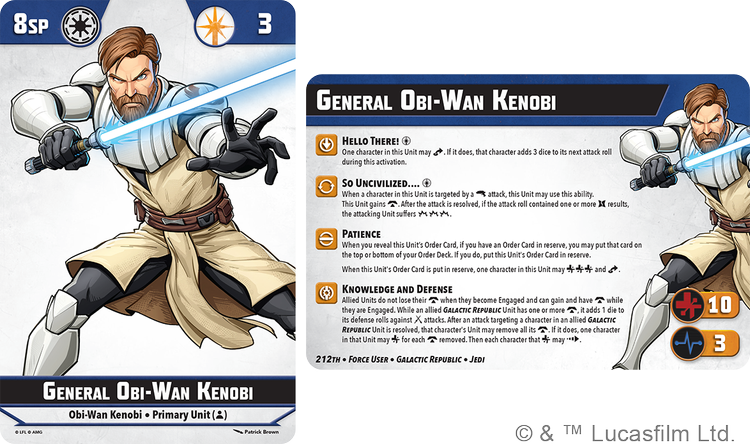 Patience - Order card manipulation is going to be a great skill to have in the game and this great at letting you find what you want when you need it. If you already have a unit card in reserve when you reveal Obi-Wan's order card you can choose to put the card already in reserve on the top or bottom of your order deck and place Obi Wan in reserve...for free.