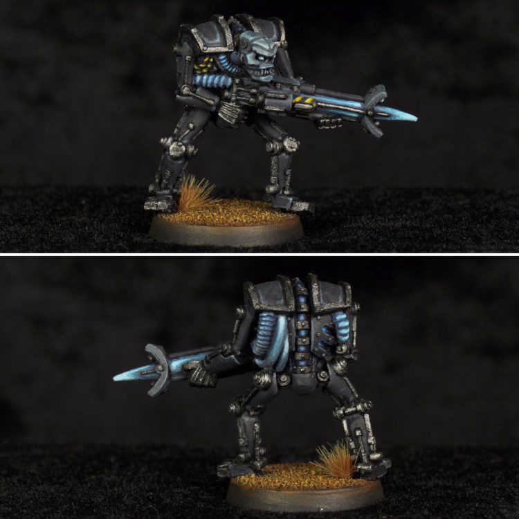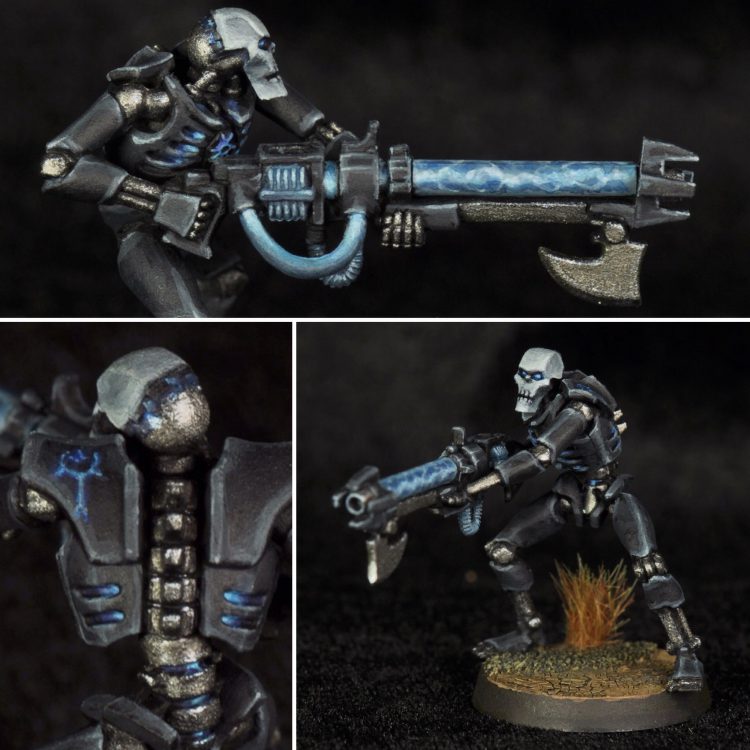 A couple Necron warriors done in Thokt Dynasty scheme. I liked how the dark grey/black armor almost reads as NMM. The old warriors are from my first 40k army started around year 2000. The hazard stripes are a bit of a throwback to an Immortal I painted at the time with orange armor and black stripes.