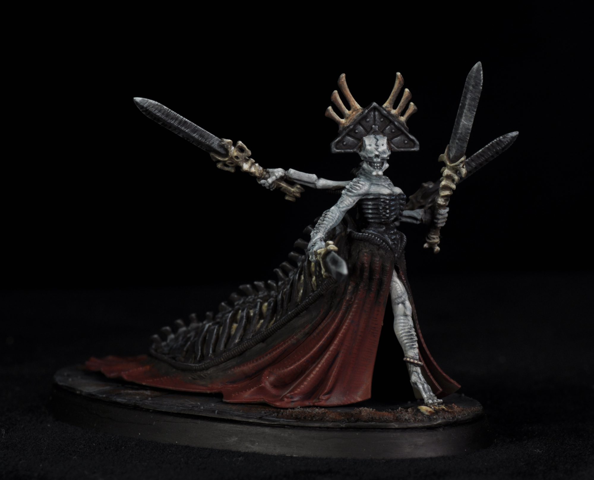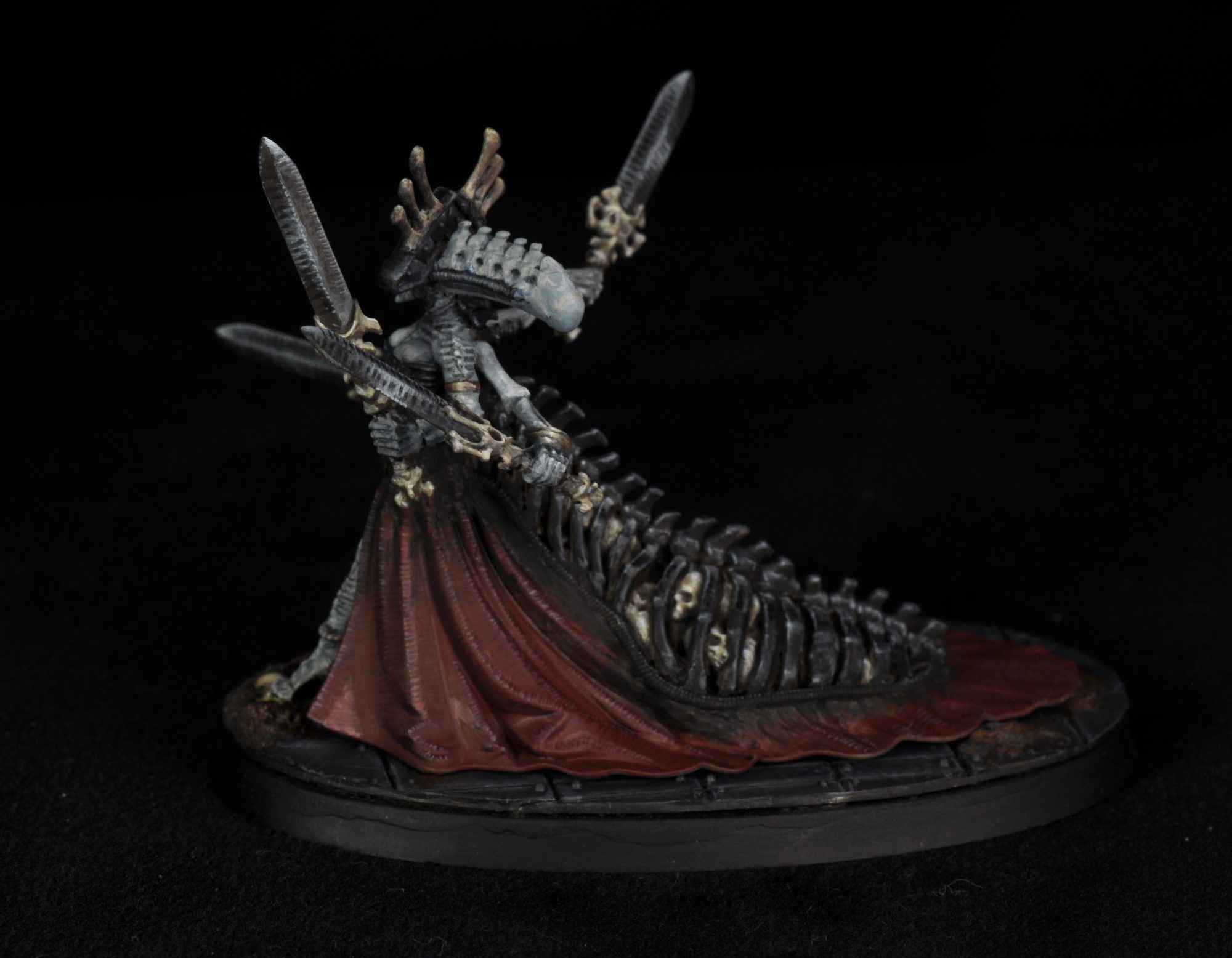 This one is another project for an Instagram contest, this one hosted by @totally_not_panicking (another pro-follow for their staggering amount of kitbashing). I based this build on Yvraine. The idea was some kind of biomechanical cult matriarch, along the lines of genestealer cults. At some point I may fill out the war band with GSC neophytes kit bashed with skeleton warriors. It was something that has been in the back of my head for a while. Seeing some other kitbashes of Yvraine in a blanchitsu style brought my attention to the regular segmented lines on her that reminded me of H.R. Giger's work. With this I wanted to push that effect to the max. Using bits from the Bonereapers range and some skeletons parts helped to amplify the effect. Greenstuff was also used to build out the back of the head and to add ridges crossing the lines to make them look more biological than Aeldari decoration.