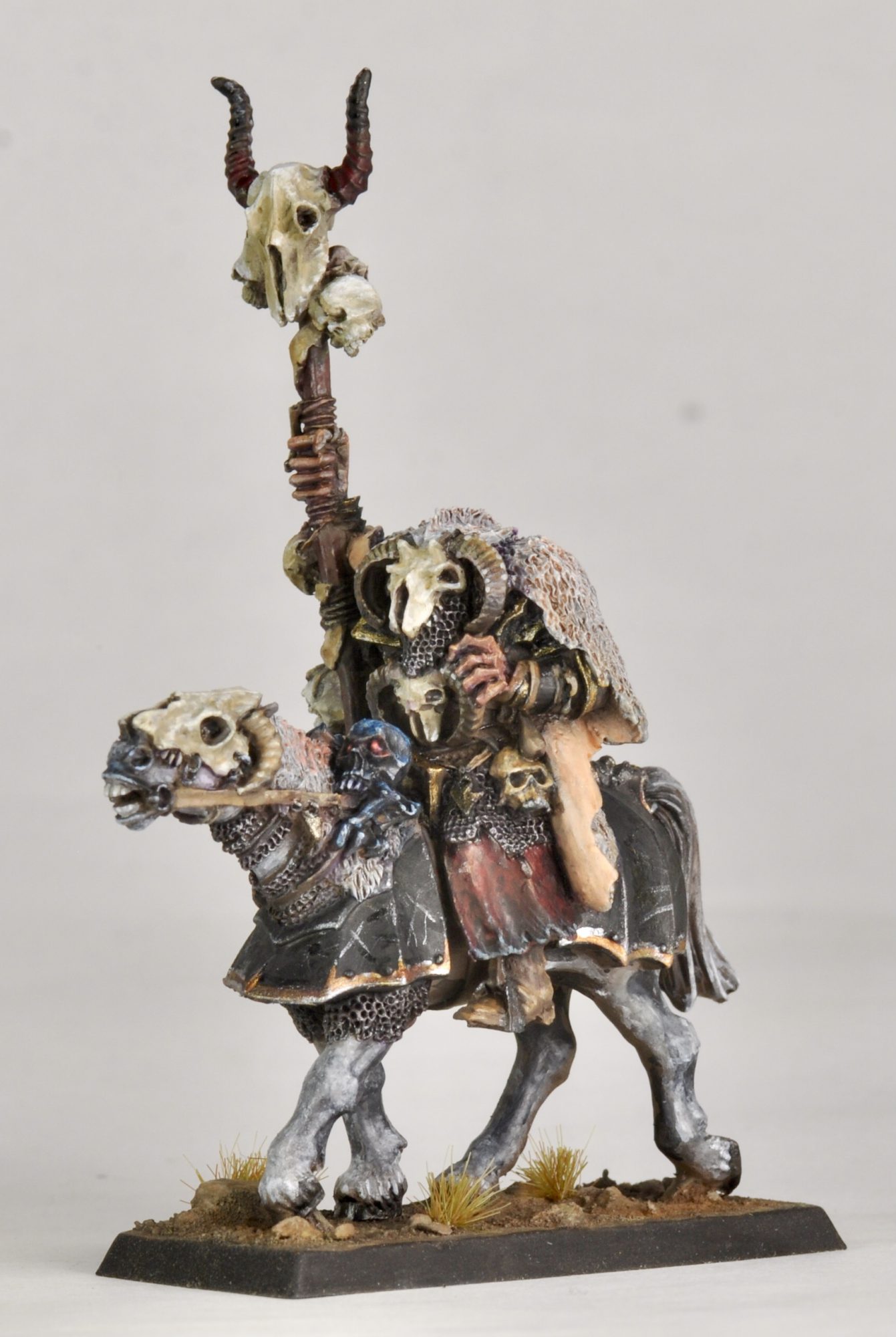 Early in the year I picked up enough models to build 2000 points of a 6th Edition Hordes of Chaos army. This mounted sorcerer is one of my favorites out of the range. I did some minor greenstuff work to add some mail to the legs and around the bottom of neck, and then some fur to the back of it and around the rider. Just enough to blend the generic barded horse with the unique horse head he came with.