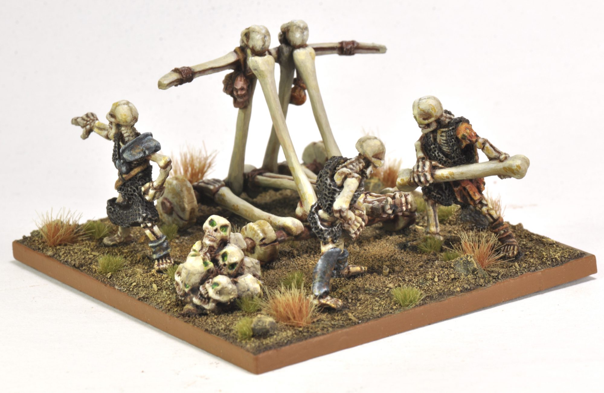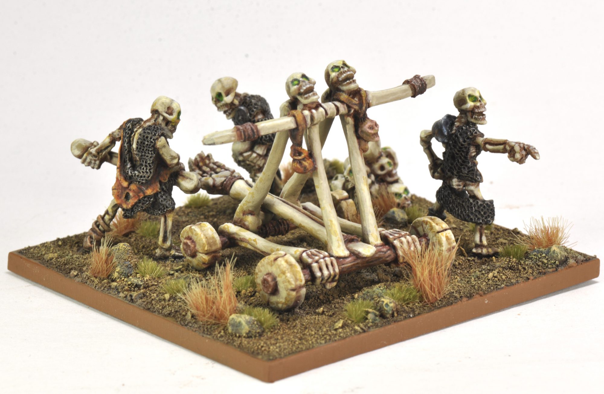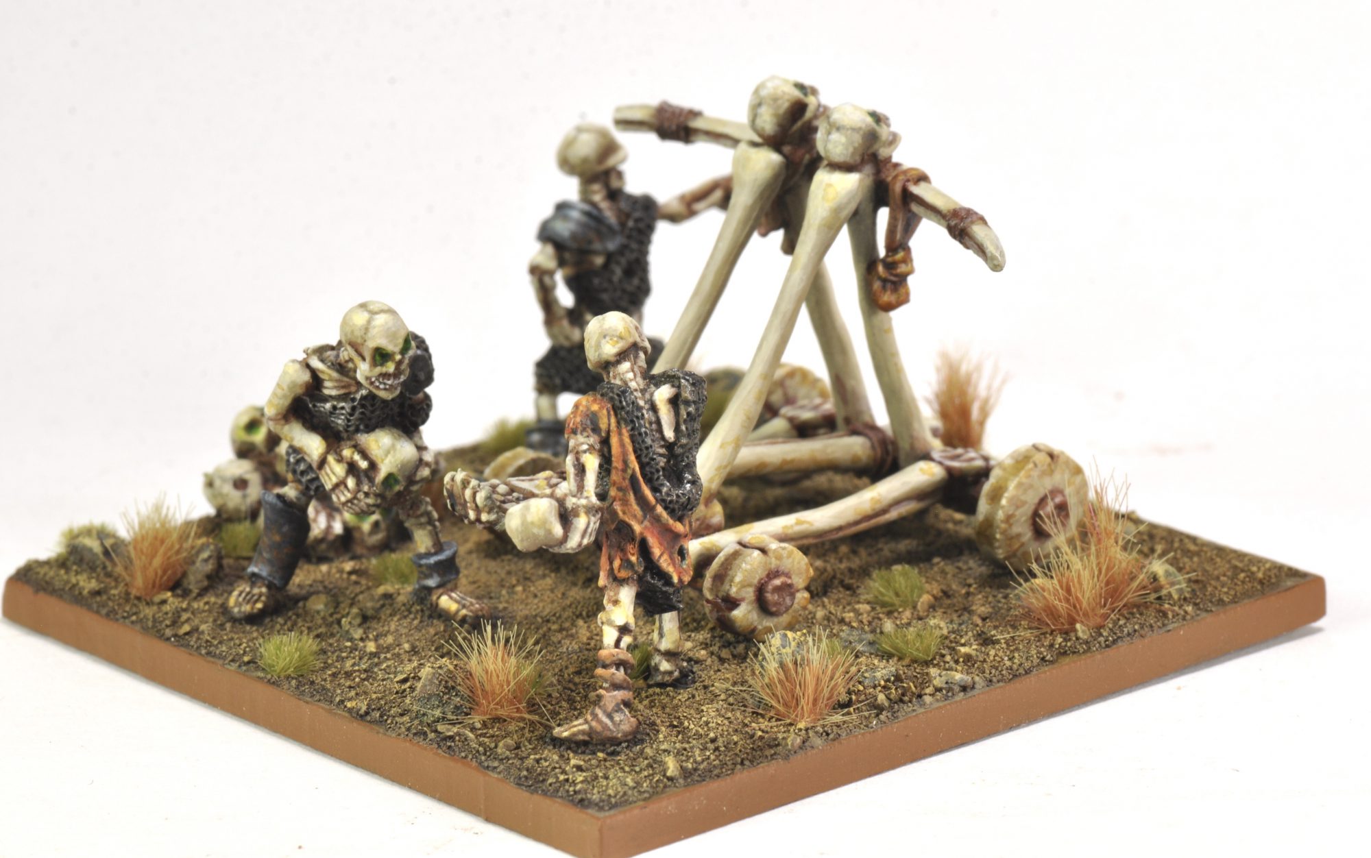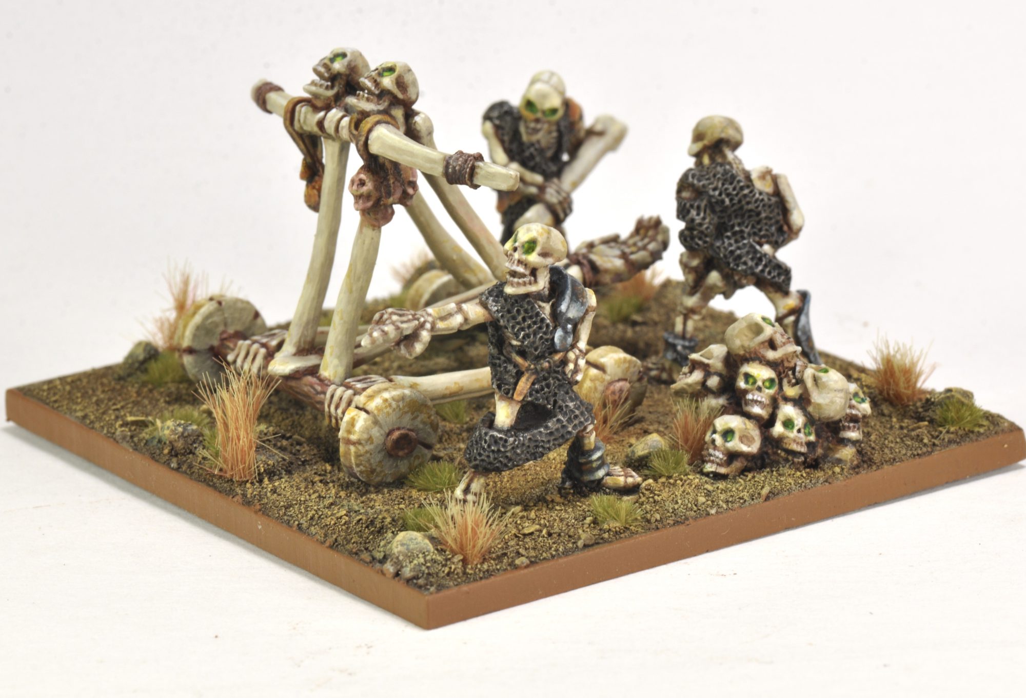 This is another rehab from my early Undead collection, done for #deadcember. The original had the skeletons and skulls each on a separate base, and nothing for the catapult. Putting them all together on a 70mm base helped to make them all feel like one model. The basing was done with Agrax around the edges and Seraphim Sepia toward the middle, then dry brushed with shades of light brown. The bigger rocks were Basalt Grey, dry brushed the same as the rest of the base. This is the first time I've done a base rim with Vallejo Game Color Beastly Brown, and I like the effect.