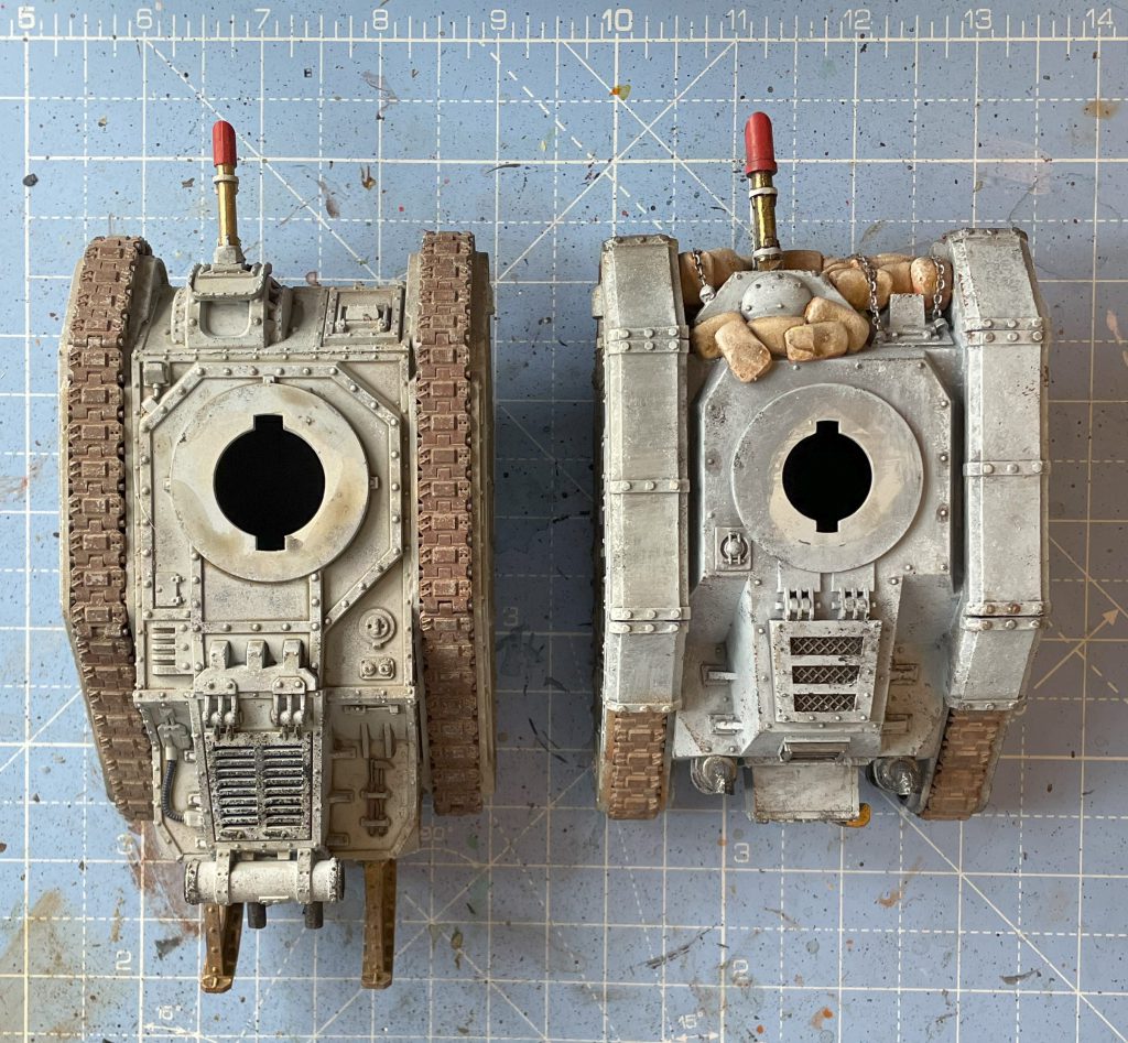 This isn’t just obviously a Solar Auxilia tank, it’s also clearly a 30k tank. The additional detail gives a much higher-tech look to the 30k than 40k russ - everything is a little brassier, more arcane, more reliant on high-future technology- while the sharper corners and huge number of rivets anchors it into an early Second World War aesthetic. Futuretech meets 1920-40? That’s the Heresy, alright.