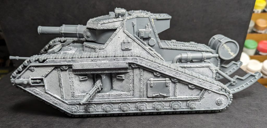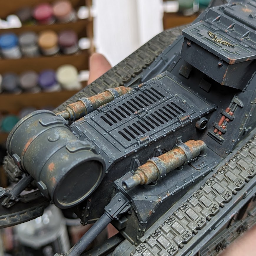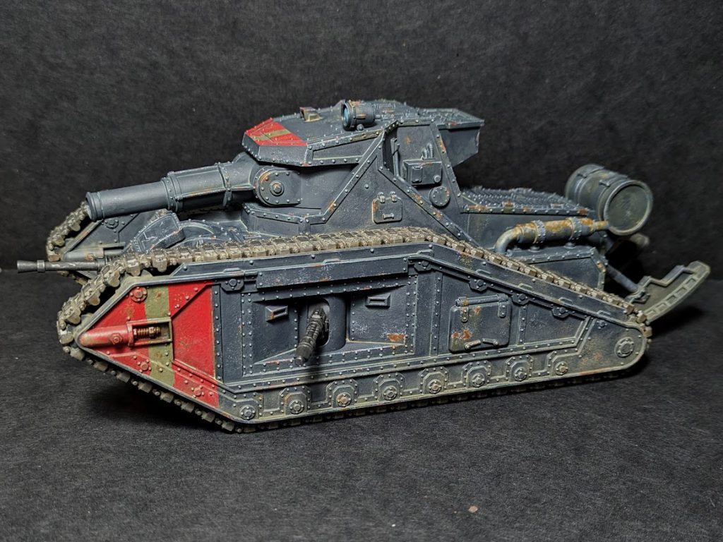 which we reviewed previously, the Malcador shares many of the same design notes. It has the same later World War I aesthetic, the same riveted construction, and it is a really long lad. However, the addition of the "turret" (we'll get into that in a minute) and the loss of the track armour changes the aesthetic quite considerably.