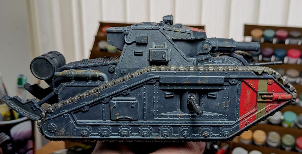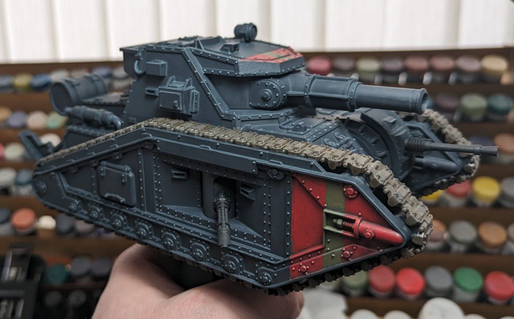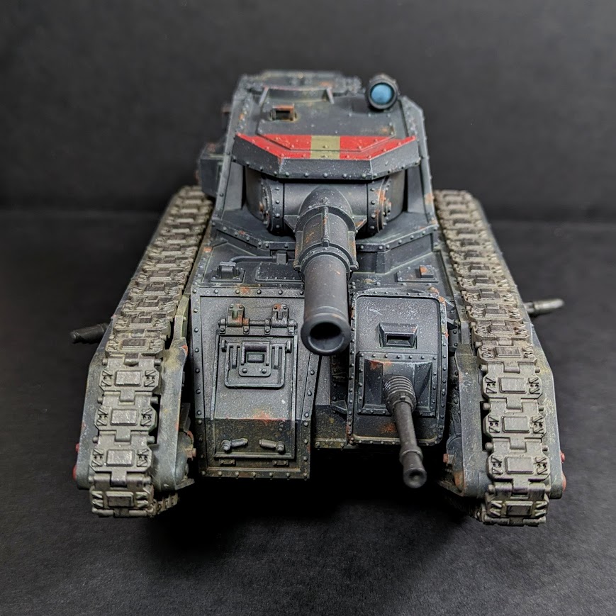 I decided quickly that since I don't have a Solar Auxilia force and I don't want the temptation of starting one, I'd paint this up in the colours of a friend of mine's army and donate the piece to them after this review (it's very important that miniatures are loved and get a good home). So I switched my original plan from a yellow-green WW1 British inspired scheme to a Panzer grey one. I basecoated the armour Vallejo Black Grey, with Mephiston Red and Vallejo Olive Drab flashes, and then applied enamel washes - Panzer Grey-Green for the grey, and Black for the Red and Olive Drab, both from MiG. Cleaning them up and then going back and applying highlights (edge and rivet highlights with the base colours with a little white mixed in) left me with this crisp-looking beast.