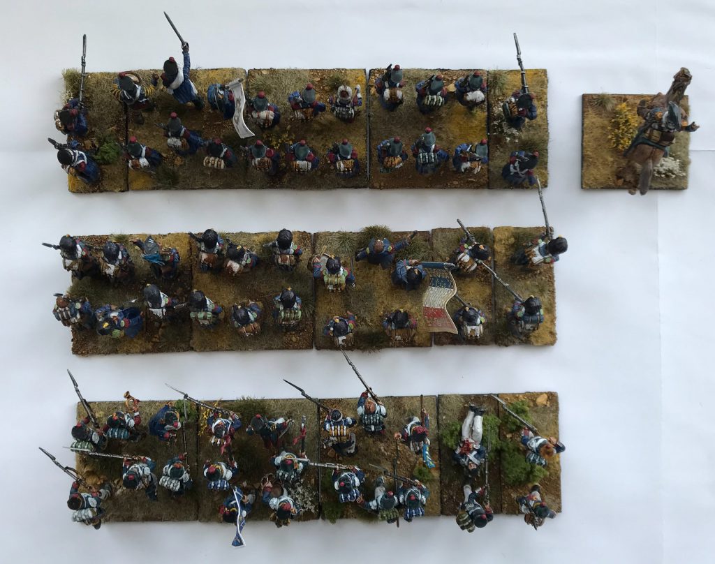 bases, and basing is an important consideration for the game. Bases act as the fundamental building block of the unit - you attack, move, take hits and remove by base. Bases also give a visual indicator of formation and unit readiness, with order/disorder shown very simply with neatly or disrupted base formations. Units with many bases are more powerful, more difficult to manoeuvre and offer more staying power, than smaller based units of the same type. That means you'll want to think about how you're going to base your men, and what you want each unit to look on the field. With your multibases, you'll also want either individual or paired bases to act as skirmishers - a couple of generic (or if you're fancy, voltiguers/flank company/rifles) skirmishing models per regiment will do you fine.