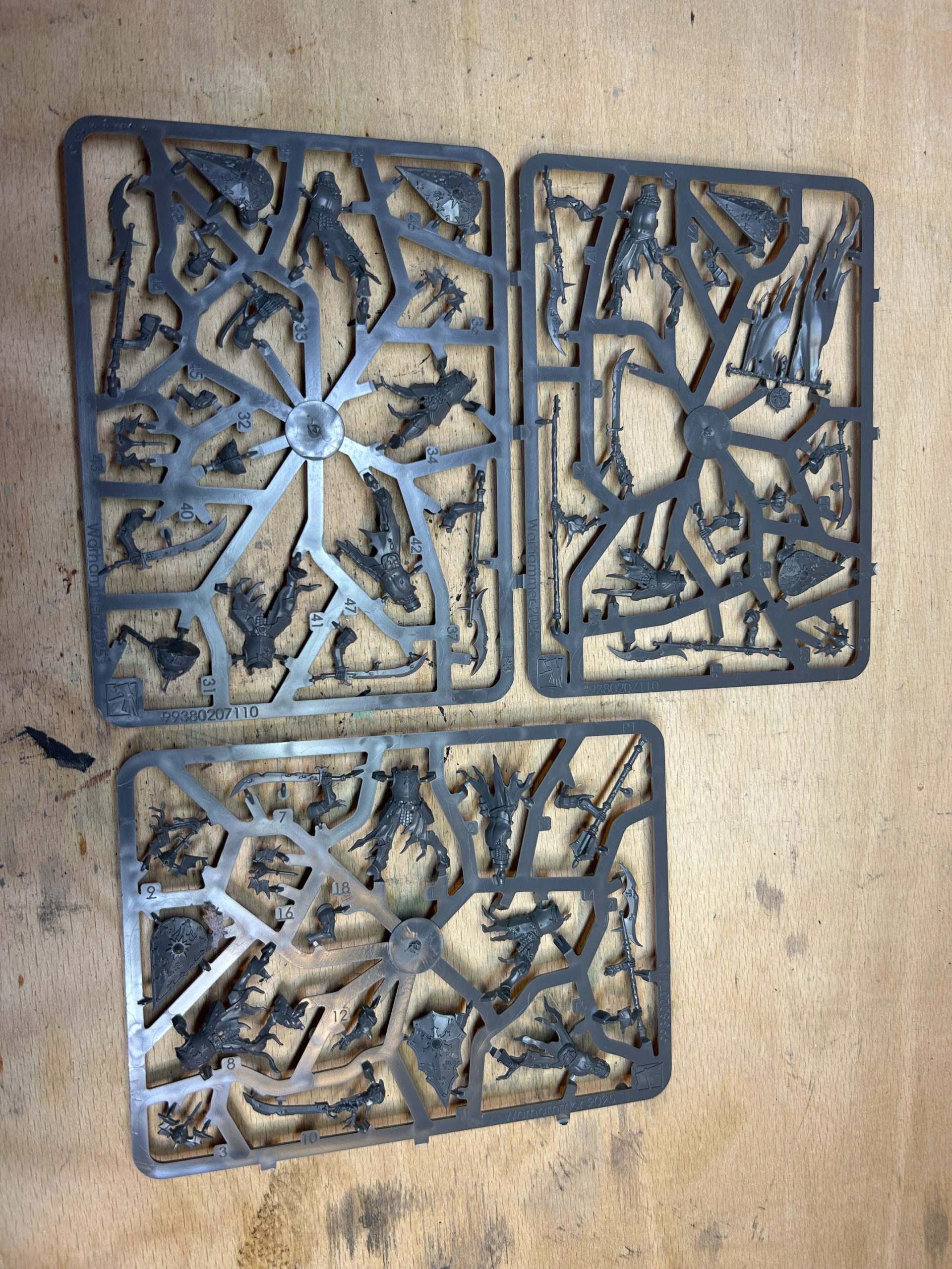 Sprues! Three sprues to make 5 Barrow Guard. So that's a mighty 12 sprues to make all 20 Barrow Guard (formerly Grave Guard). You get a number of options per base model. So whilst not fully customisable, there’s enough variety to make things interesting. This is pretty standard for most of these GW kits now and I’m behind it. I’ve heard some moaning that you can’t customise as with fully modular kits of old. But my attitude is that if you want to convert and kitbash, you still can and the trade off for the cool and dynamic poses you get out of the base models is well worth it. Great.