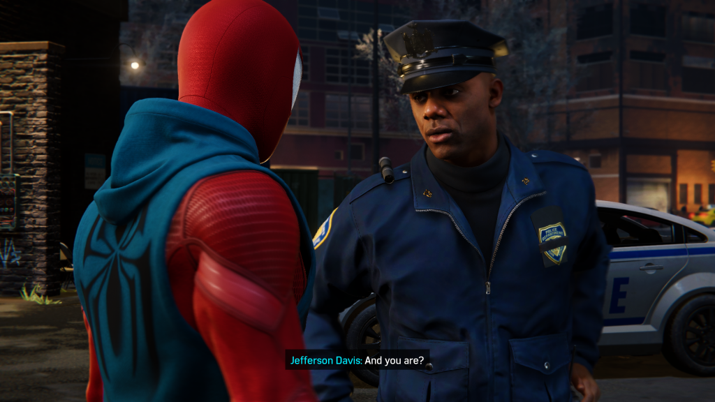 Well, not the entire game. There’s a mission where Peter gets evicted. At this point in the game he’s been running around putting out fires in his personal life that he kind of started, from his day job as some kind of hazy post-grad at Otto Octavious lab, which is doing work for the Defense Department but not getting DOD grant money apparently, to his currently off-again relationship with Mary Jane Watson, who in the least-interesting possible character turn is doing the plucky reporter gimmick for the Daily Bugle, to his ridiculous moonlighting as a non-deputized peace officer simping for the approval of NYPD captain Yuriko Watanabe. That verb was specifically and disapprovingly chosen; Peter’s behavior towards Yuri is kind of difficult to tolerate for the first 20 hours of the game or so. He asks her out on dates despite her turning him down repeatedly and does silly voices and everything; it’s pretty uncomfortable. There’s an entire “Spider-Cop” persona that should have just been cut from the entire game.