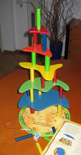 Players must work together well enough to build to the fifth floor of the villa, since that’s the only way to control your destiny as the victor; if the structure topples before Floor #5, the winner is essentially chosen at random. But if the top floor is reached, then the winner is the player who has the most dowels of their own color placed on the fifth floor.