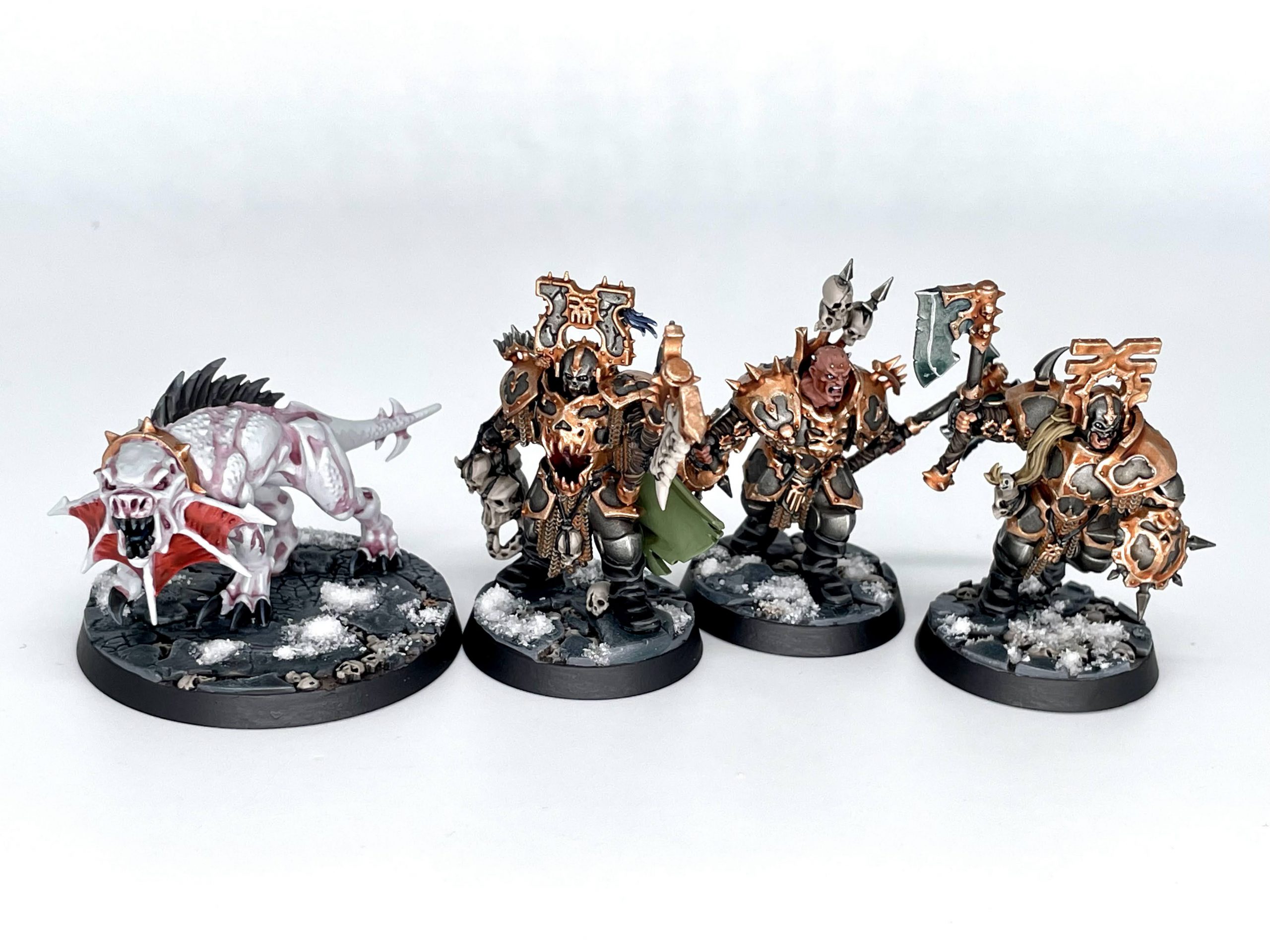 I have been attending Saturday night hobby hangs over Zoom, then Discord, over the past two years and change. These are largely attended by members of my old gaming group and Goonhammer's finest, and many of these get rowdy. On a particularly intoxicated occurrence of this weekly ritual, I attempted to grade the "mouthfeel" of a number of models. The Khorne Hound in Magore's Fiends scored the lowest, and I would not recommend repeating my mistakes. I was feeling the desire to paint a "squad" of something, but wanted a change from the Stormcast I had been working on, so I knocked out this Warhammer Underpants warband that had been hanging out in my backlog for a year or two. I have some plans for a grand unified army of Chaos involving all the sundry Chaos mortal factions in Age of Sigmar, but this is it for my Khornate units at time of writing. I found the models reasonably enjoyable to paint, with their oodles of trim being curbed by the small batch size of the warband. The Khornedog was especially fun though; I love painting volumetric highlights, and the pale skin of this bad doggo was enjoyable. I eventually acquired a box of Bloodletters I intend to paint the same way.