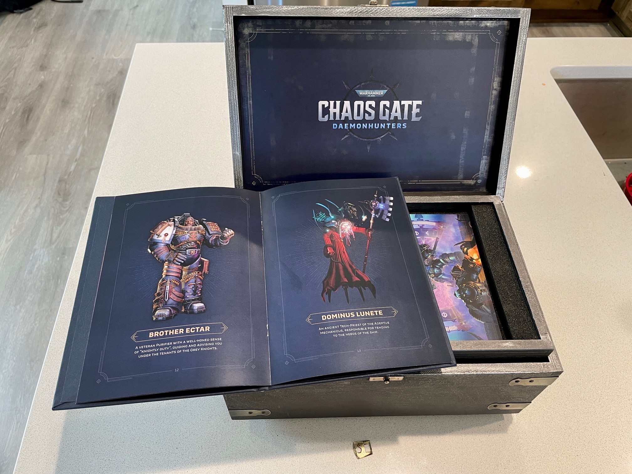 Chaos Gate: Daemonhunters. This was part of their influencer outreach program, so by that logic I'm an influencer now. That's one more thing I need to explain to my parents, I guess. The box had Castellan Crowe, a cute little artbook, some paints and hobby supplies, all in a neat Inquisitorial wrapper. I had written up a big article on this box and all its contents, but since it wasn't something the general public would be able to get their hands on, we killed the review. It was the right call, but murdering one's darlings is seldom an enjoyable experience, especially for said darlings. I also totally don't keep my weed in there now.