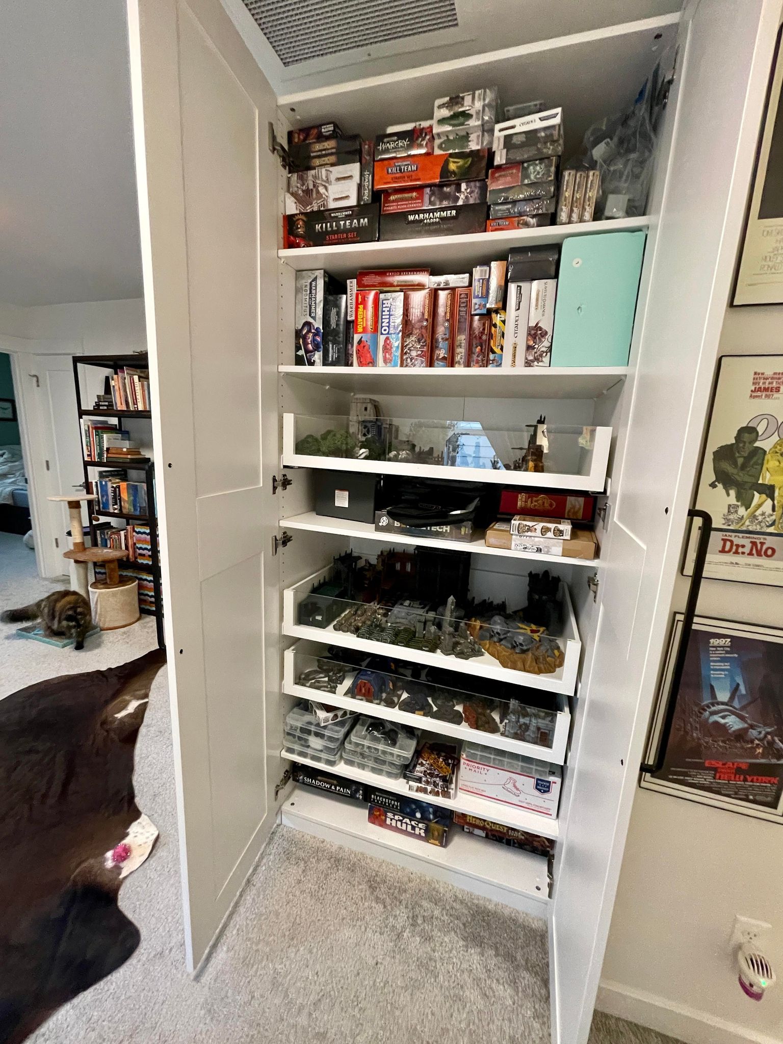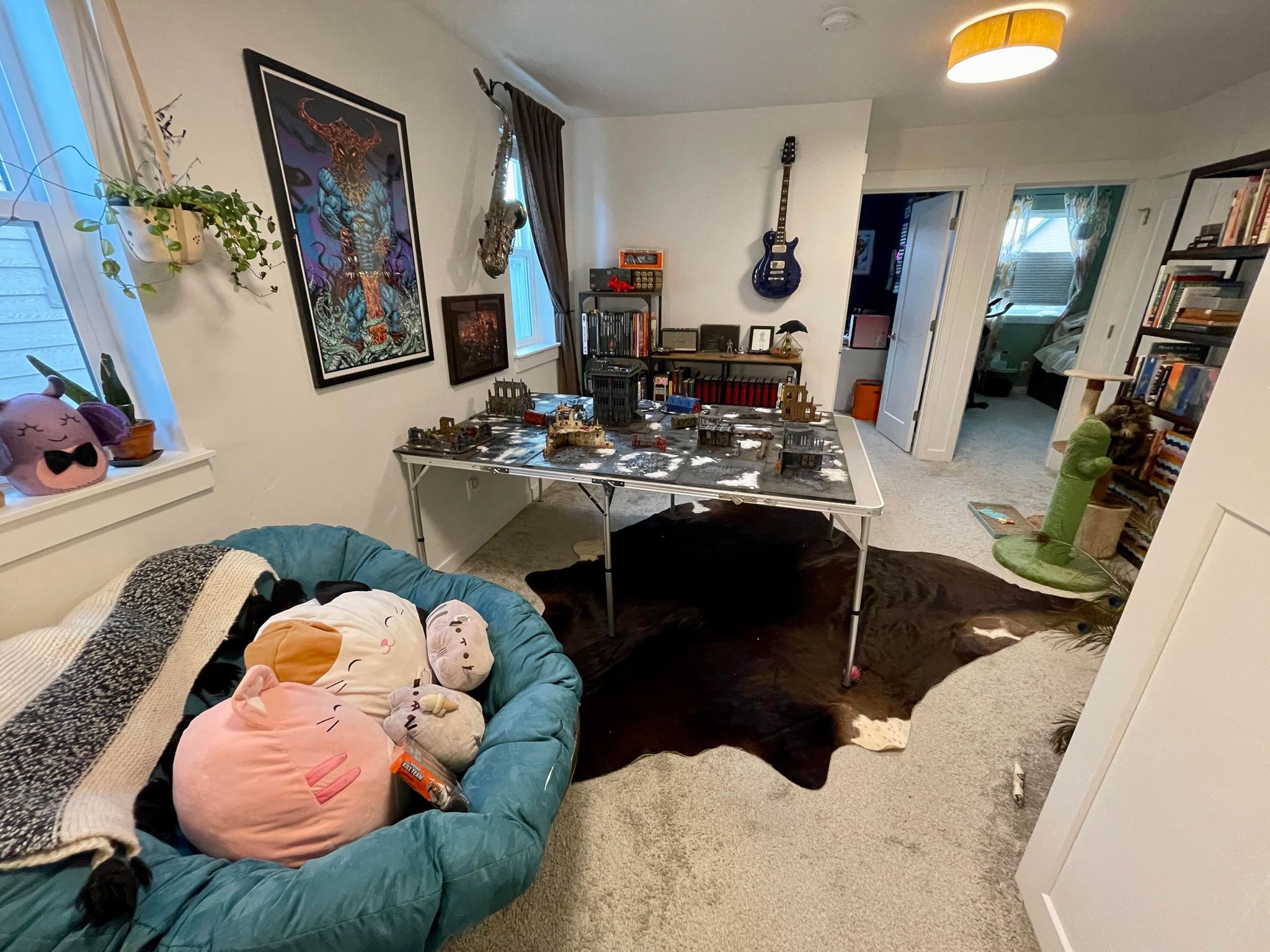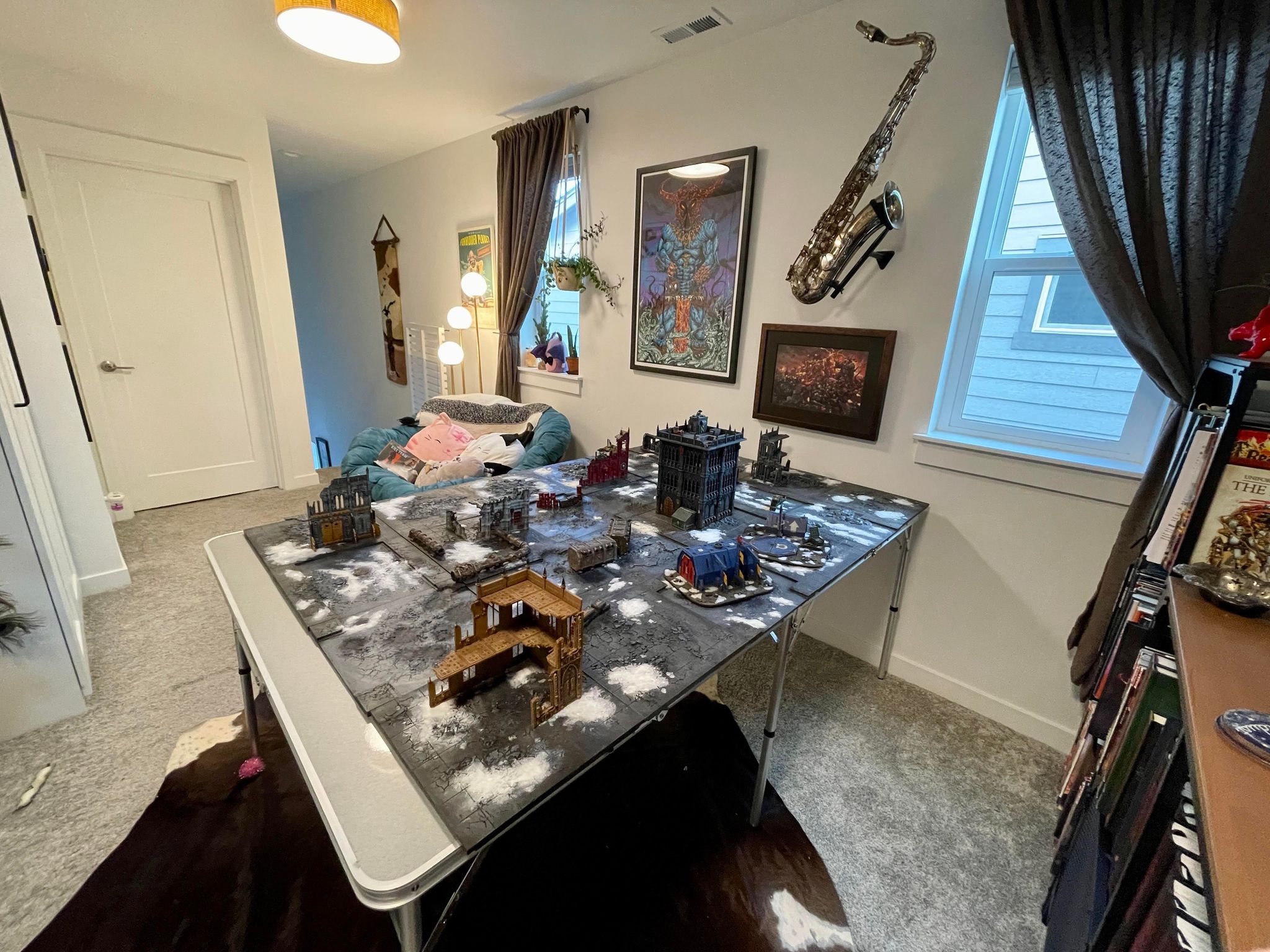 This would involve a large wardrobe cabinet to hold my terrain and backlog, some shelves to hold my gaming books and accoutrements, and a space large enough to lay out my 6x4 Alpha Gaming Table from Firmer Terra. Said table can be stored in the laundry room when not in use, and as a result my home gaming experience is far more comfortable, with something like a 10 minute setup or teardown time. Before, a game would involve getting a table from the garage, moving a couch and rearranging the living room, running armies and terrain up and down the stairs, and it was a whole production just to roll some dice. One thing I've learned from my painting is that any barriers that you can remove will make you more likely to Do The Thing, and at this point I have the least friction between myself and gaming at home that I've ever had. I am extremely privileged to have the space, resources, and supportive partner to make this sort of thing happen, and I recognize that.