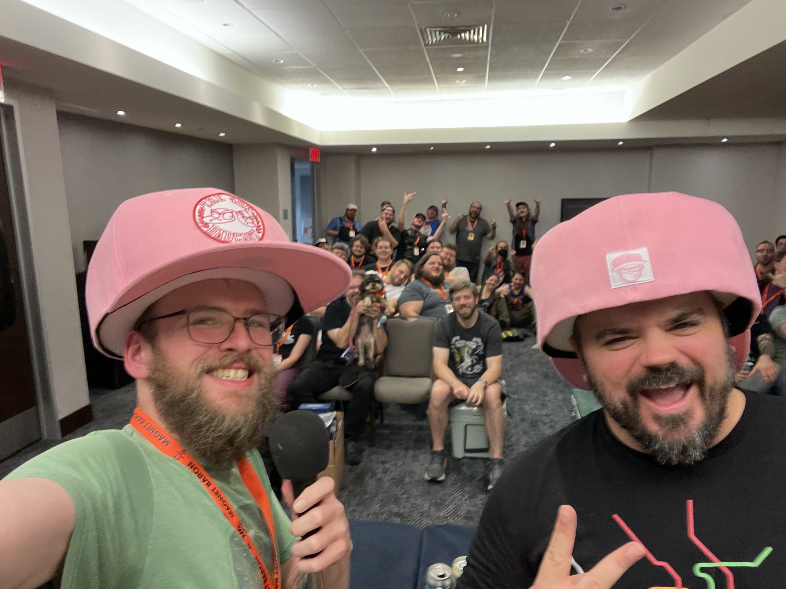 Campbell "SRM" McLaughlin and Dan "Dittka" Boyd and their very normal sized hats at NOVA. Credit: SRM