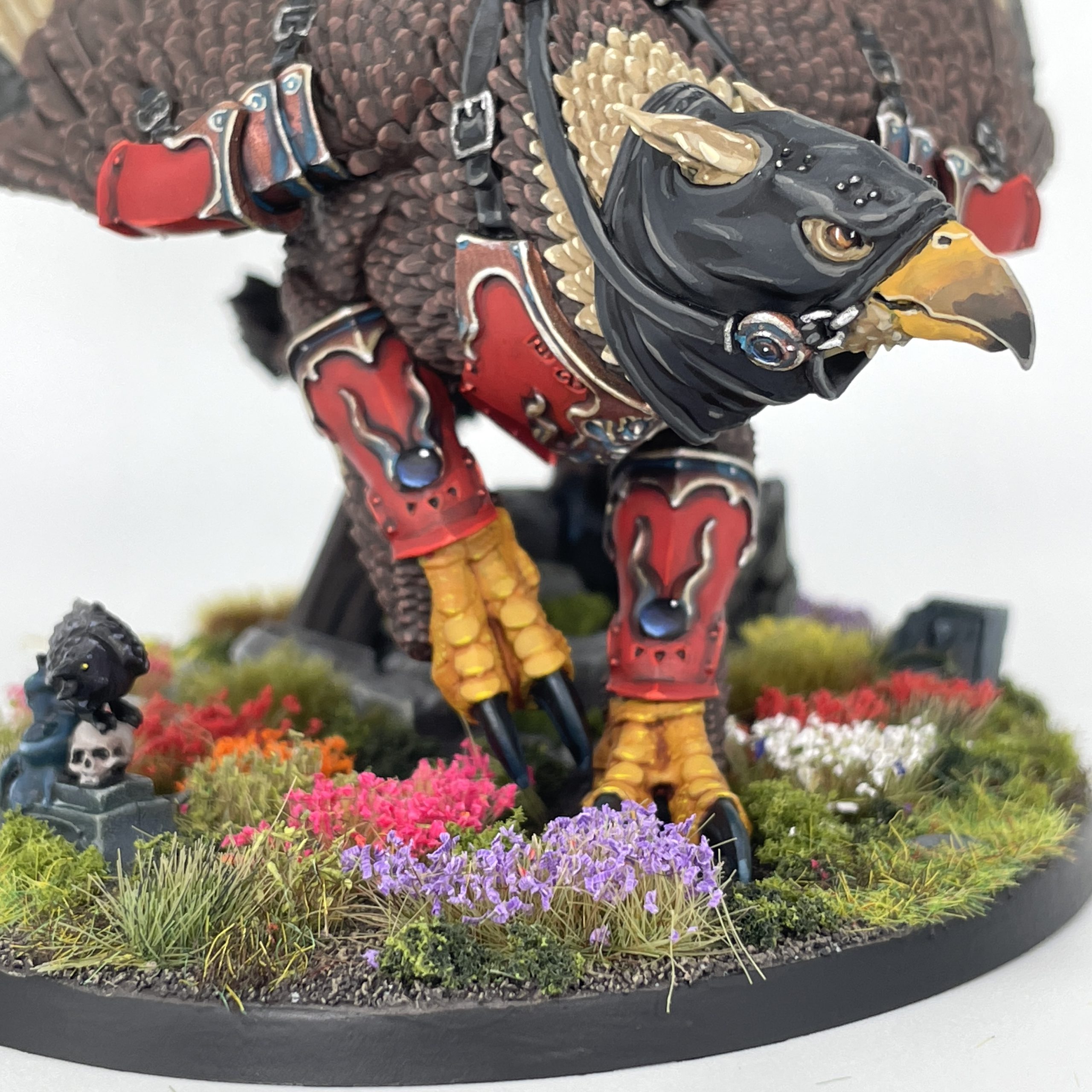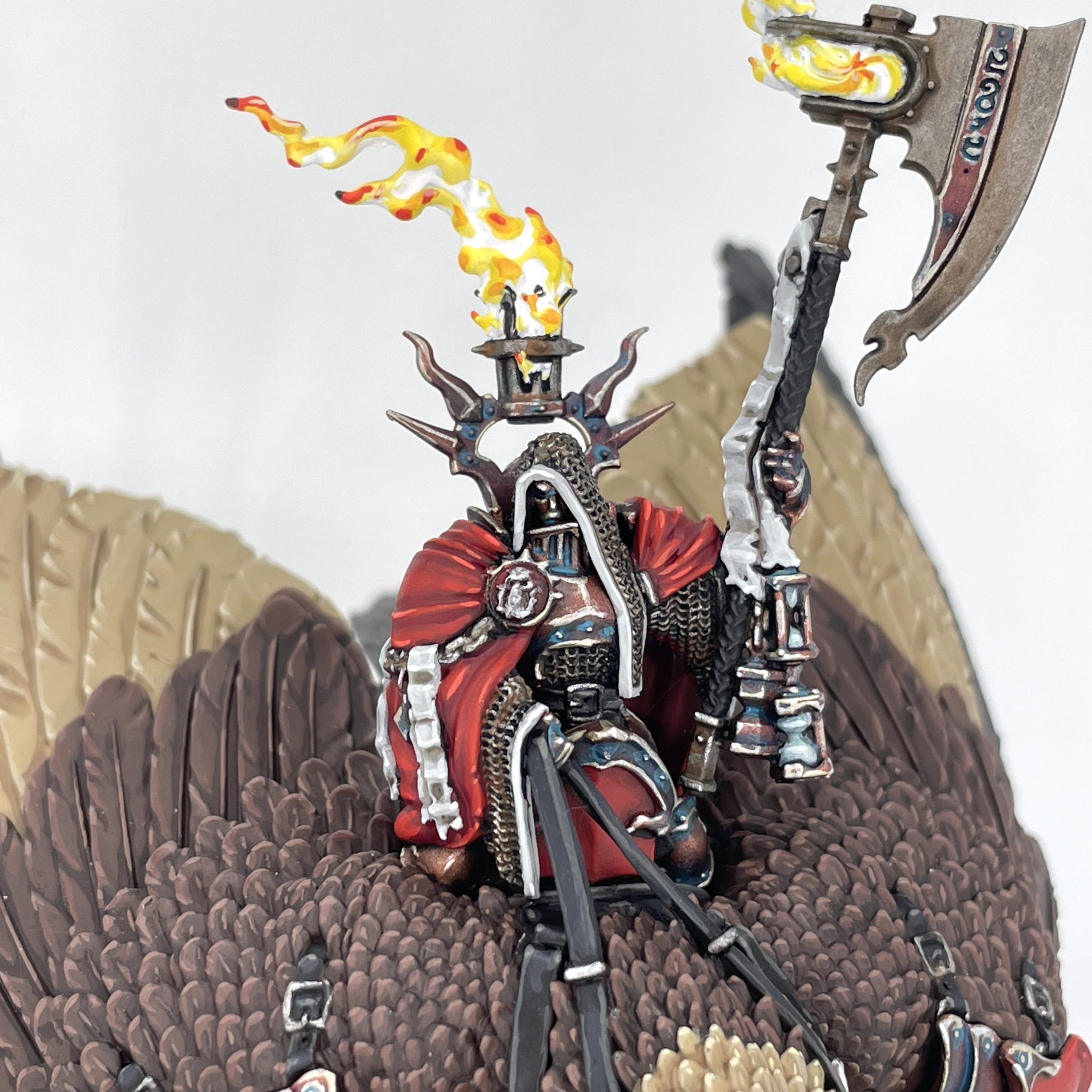 Despite Stormcast being kind of my "easy" army, I still wanted to flex with this big monster since they were such a centerpiece. I'd go further if they were in my Templars, but I had a Warcom deadline to hit, and as someone who generally avoids painting huge monsters (I just like painting lots of little dudes, so sue me) I didn't want to spend a whole month on a single model. Instead I just ground away at this big birb and their nonbinary rider (that's canon!) for like two weeks, meticulously highlighting each feather and working on my flame techniques.