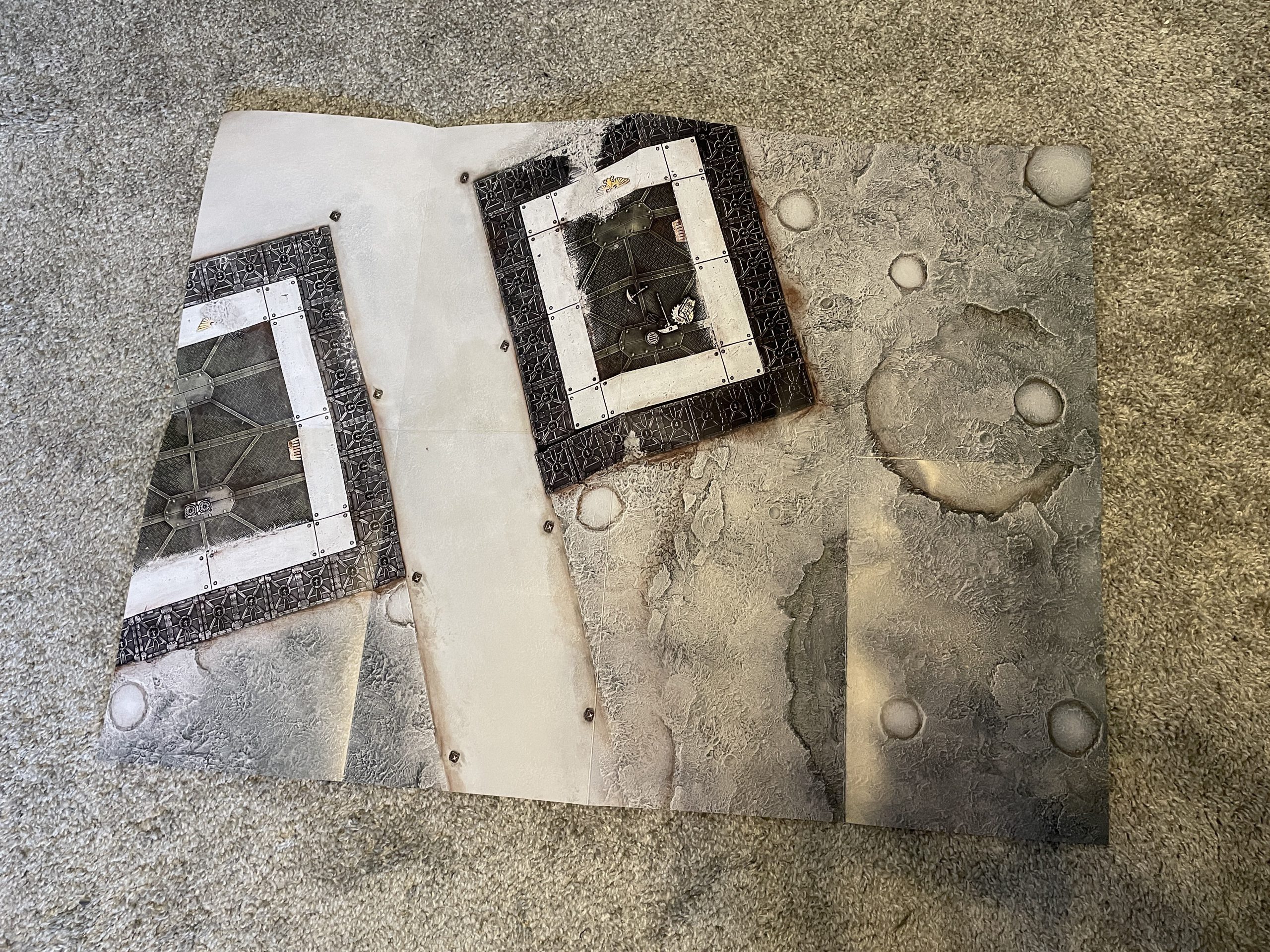We finally level up from the tiny paper playmat to a firmer, larger paper playmat. This 22x30 mat replaces the old Mars/Necron Discotheque one. This is half the size for even a Combat Patrol 40k game, but the exact size of modern Kill Team. It's forward thinking and more useful than the previous one for longer-term hobbyists. This issue's scenario uses this new Mars-themed side, which has printed spots where we will later place some Munitorum Cargo Containers. A small boxout tells you to ignore these for now, but future issues will have said terrain in them. However, on the other side there's a treat for Goonhammer readers: a moon-themed board which I dub