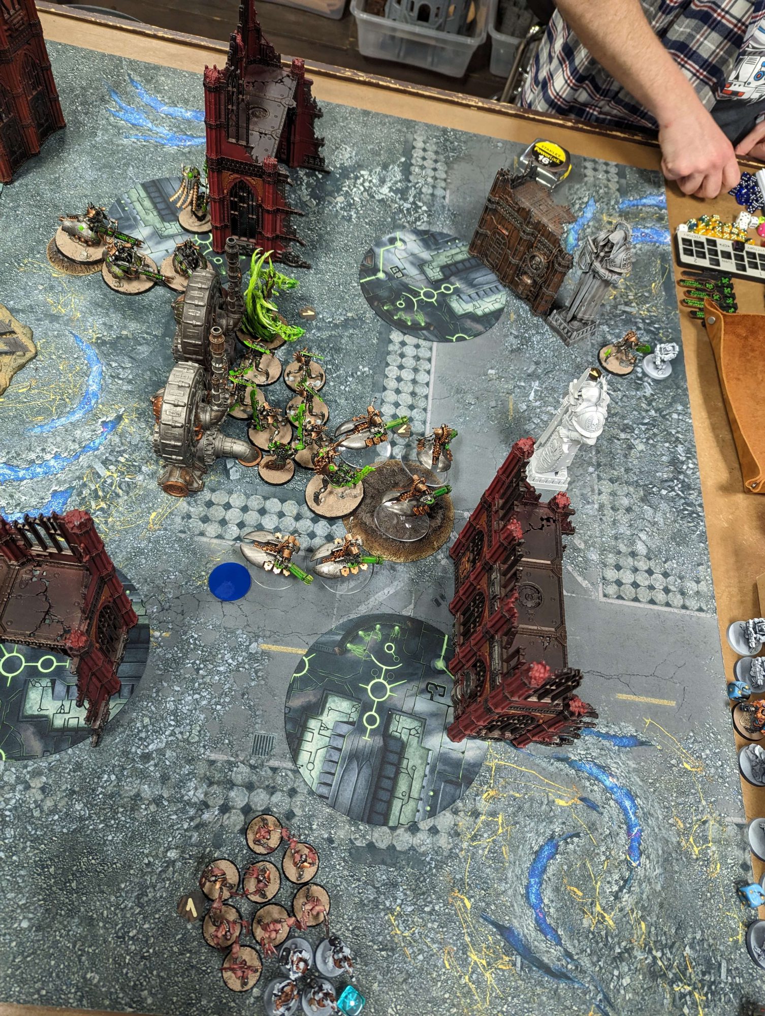 The Battle Above, takes us to the stars above Kjalma's Skull, where Necron boarders have teleported aboard the Imperial vessels. It's up to the human defenders to keep the Necron invaders from sabotaging the ammo stores and engines of their ship, and this is represented in a wonderfully asymmetrical mission. The Necrons deploy in a tight corner representing maybe 1/8th of the board. The Imperials deploy in a long L opposite, stretched thin across a broad expanse. 5 objectives scatter from the center towards the Necron player, and if they can sabotage 3 by the end of turn 5, they win the game. There are no other objectives - it's just sabotage or die. I love this. While the terrain supplied thus far might need to be finagled to get a real boarding action vibe, it's a thematic and fun mission that sounds like an absolute blast to play.