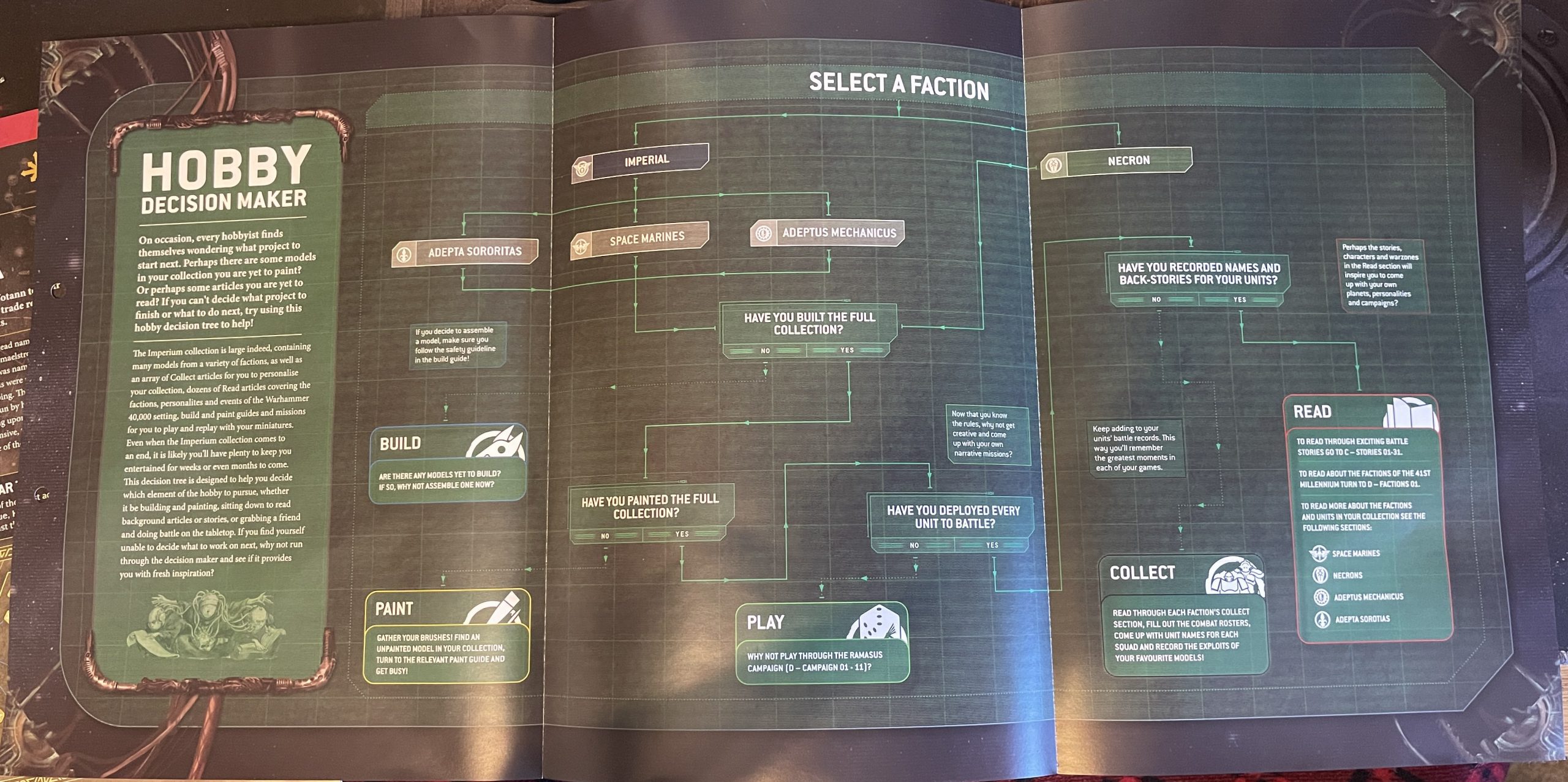 stupid ones. Surrounding this are pages with little blurbs for Necron or Imperial victories in this campaign, but overleaf is a flowchart for planning your hobby progress, pictured here. The green on green (on green) design is visually cohesive while being somewhat hard to read, but more importantly it lays out a structure for how we should tackle our collections. This is interesting to me because it is not strictly a document of instruction, but one of