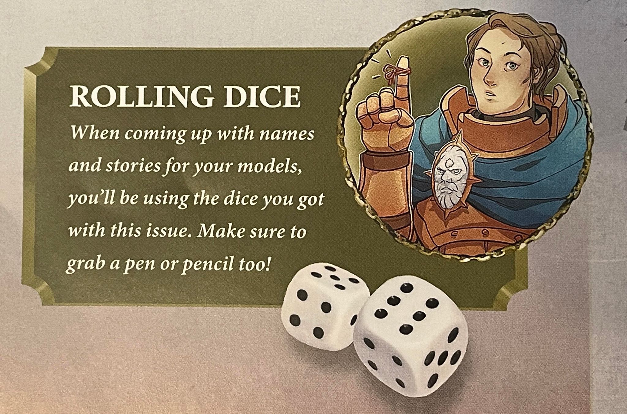 Imperium readers will recognize (and hopefully look forward to) this next part, where we are introduced to the models this issue contains. These were called Battle Records in that publication, and I'll keep referring to them as such until proven incorrect. These involve rolling on a number of tables to determine what your unit's name and background are, with the new spot to record Great Deeds. These are like video game achievements, so you can tick off the "Arcane Wrath" Deed when you roll a 12 to cast a spell with your Knight-Arcanum. It's a cute little bonus feature, and ideally encourages some fun decisions on the battlefield. Anyway, I'll roll those Battle Records up now: