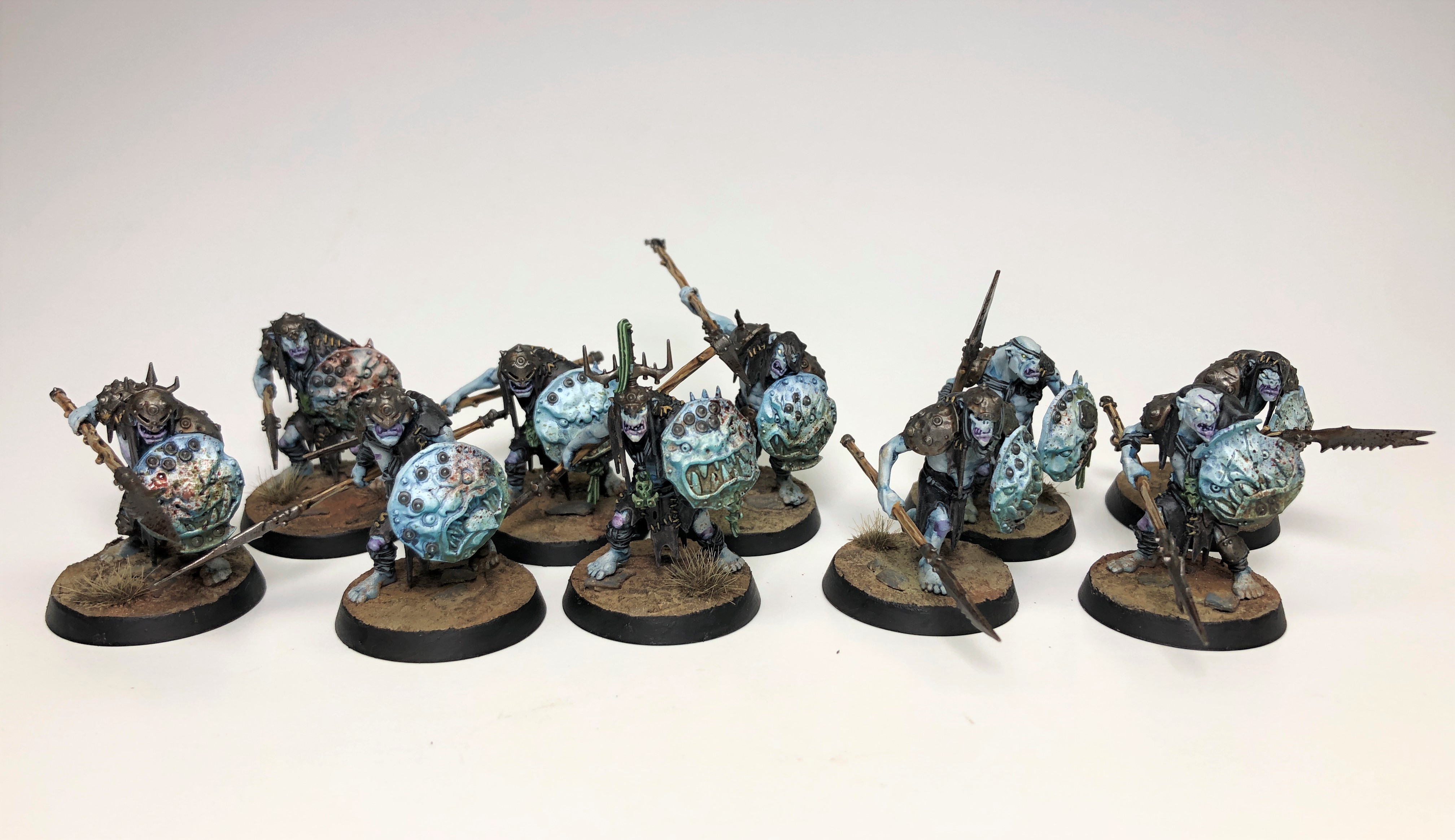 This week we get a set of 10 Gutrippaz, the rank and file troops for the Kruleboyz. These are the models from any variety of Age of Sigmar 3rd edition starter sets, and they're a great representation of the Kruleboyz aesthetic. They're potentially a little too detailed for your cheap, regular dudes with all their straps, wraps, baubles and charms, but we'll get to that more when we paint these guys later. The spear shafts are easy to bend or break, and the assembly instructions make note of this fact. My only real critique of this kit as that you can't paint the shields separately, as they're largely molded onto arms and torsos. There's also a Nintendo-esque reminder to take breaks while building models, but I'm not gonna let anyone tell me when to stop huffing plastic glue.