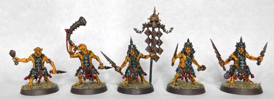 If you couldn't guess, this week contains 10 Hobgrot Slittaz, a name which still feels uncomfortable rolling off my tongue. I love the detailing on the models - their faces are characterful, their physiques are alternately kinda flabby and kinda yoked, and their weapons and armor are sharply defined. I still prefer the classic Goblin/Gloomspite Gitz aesthetic, but these little jerks fit perfectly with the Kruleboyz. Some of their poses are a bit 2-dimensional, but these are some of the cheapest chaff out there so they don't need to all be pirouetting off hero rocks or anything. There are a few head options and you can build one as a leader or a regular dude, nothing too fancy. The instructions are straightforward for these push-fit models, but glue is of course recommended. There's little bits of flavor text throughout the build instructions, talking about how much hobgrots like to slit throats (hence the unit name) and throw their grenades. The painting instructions only walk us through two colors - basing the models in Orruk Flesh and picking out the metallics in Leadbelcher. We'll see how this works when we finish these models later, as Hobgrots are typically portrayed with a sickly yellow skintone instead of the traditional Orc/Ork/Orruk green.