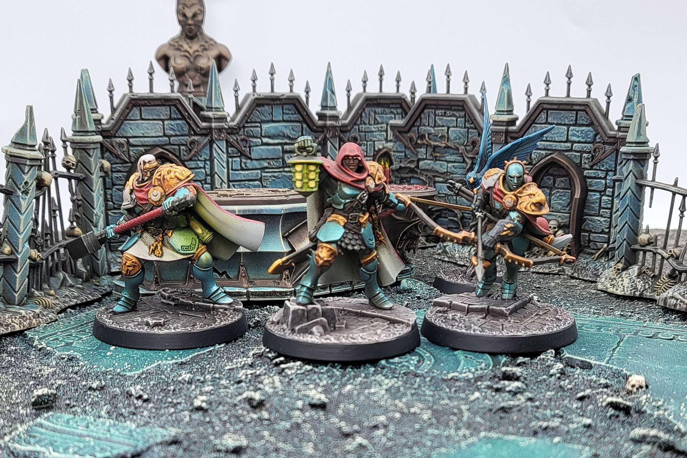 Underpants Underworlds models, they are a fascinatingly engineered three dimensional puzzle of wackadoo pieces that somehow fit together into coherent, beautiful models. That process is often a handful, with several fiddly little pieces and an easily broken bowstring. I had to hold my breath while putting pressure on a few pieces because I was so worried about breaking them. They have nicely modeled bases, simple enough to frame the models well while still setting a scene. There are a few kind of grody lumps in their undercuts, and the seams on the cloaks are in really obvious places, unfortunately. The dude with a great hammer also has no butt. I don't mean that in a Hank Hill "insufficient junk in the trunk" way, but in that his legs just end and there's a void where a butt should be. The process of painting this group is pretty enjoyable. They're somewhere between your rank and file Vindictors and a character model in their level of detail, and the sculpted bases they're on lend themselves well to washes and drybrushing. The paint guide is still firmly in basecoat territory, but with blue, gold, white and silver, these are starting to look like Hammers of Sigmar.