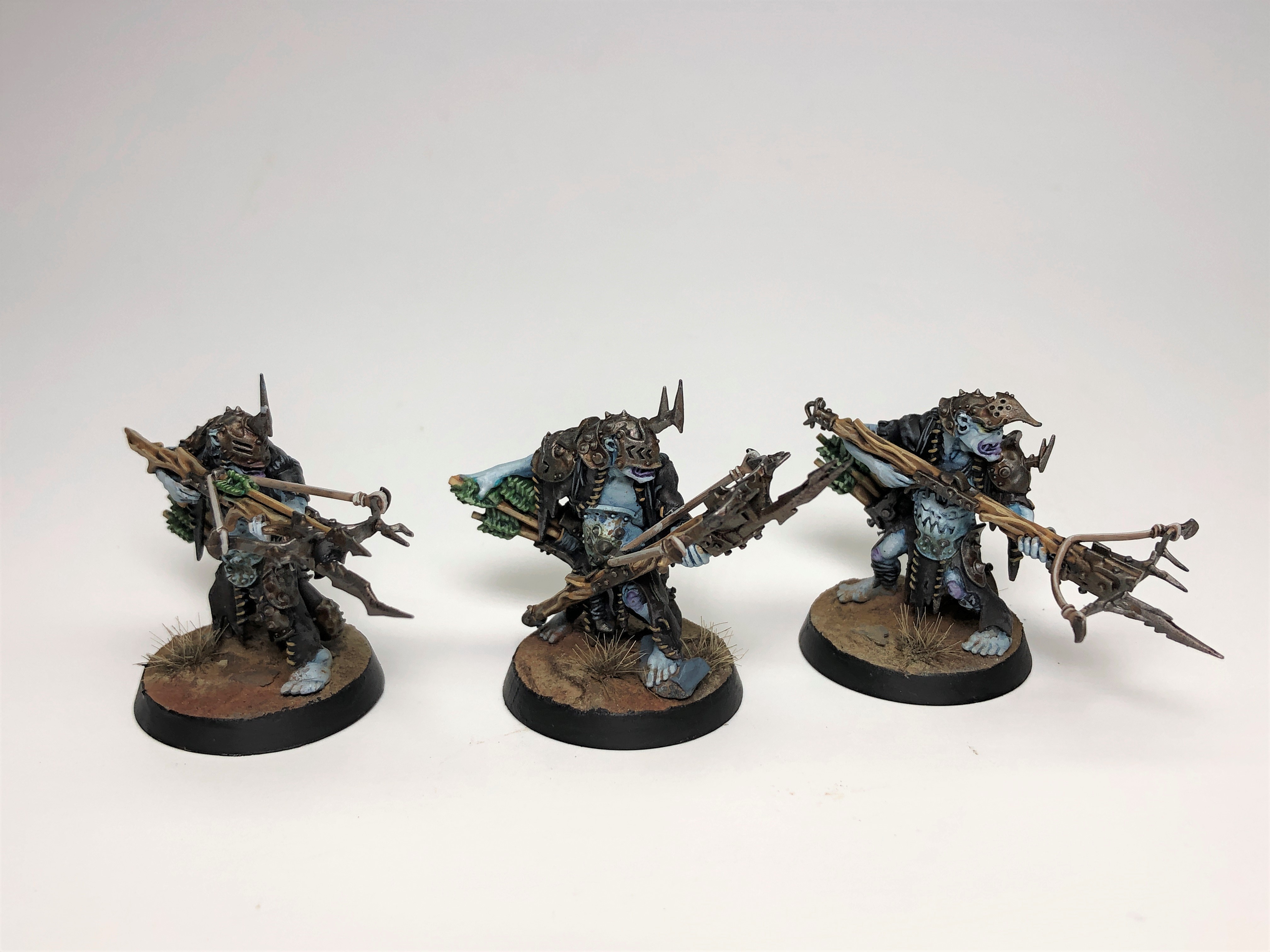This week's issue includes a trio of Man-Skewer Boltboyz, common ranged support troops for Kruleboyz armies. The models feel a smidge two-dimensional, with only their oodles of overlapping detail preventing them from looking flat. The details are distinctive and sharply defined though; I love their helmets and the sheer brutality of the bows. They've got some fiddly pieces in helmet crests and the crossbows themselves, so you'll want to be careful in assembly to avoid snapping any spikes or bowstrings. The painting instructions offer some useful tips, like starting with dark colors and working your way up to lighter ones, as dark colors generally cover better and thus are better for fixing mistakes. It also suggests that you clean your brushes regularly, especially while using metallic paints, as they can clog your brush and affect its lifespan and shape. All of these are good bits of advice that a new painter should probably hear.