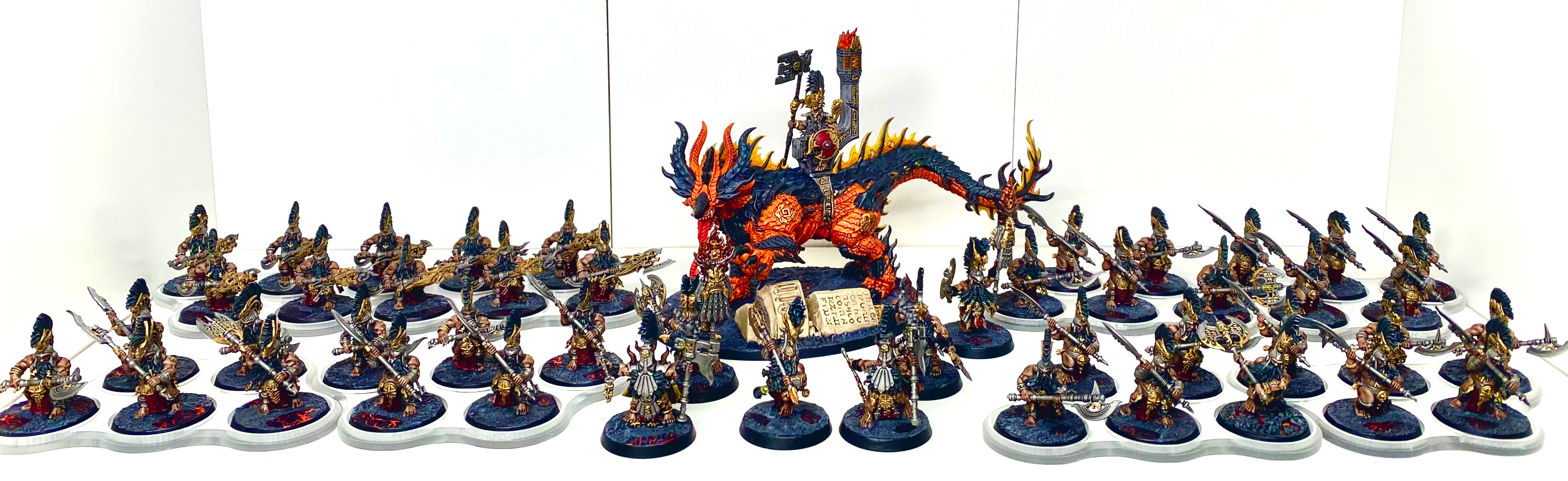 We next get a short article on Fyreslayers, or as I have alternately derisively/affectionately known them: Butt Dwarfs. These are why Gotrek was on the cover, I imagine, though he doesn't make an appearance here. These oathbound mercenary warrior-priests are hunting for ur-gold, fragments of metal that contain the essence of their war god Grimnir. They forge runes with this metal and hammer it into their skin, which is what grants them their power. That's assumedly why they're naked. They also ride giant fire lizards called Magmadroths and live in Magmaholds, fortresses inside active volcanoes. If you're familiar with old Warhammer Fantasy, they're just Dwarf Slayers taken to the nth degree. I still feel they're a bit underbaked as a faction, and that the Slayer archetype may not have been enough to carry a whole army.