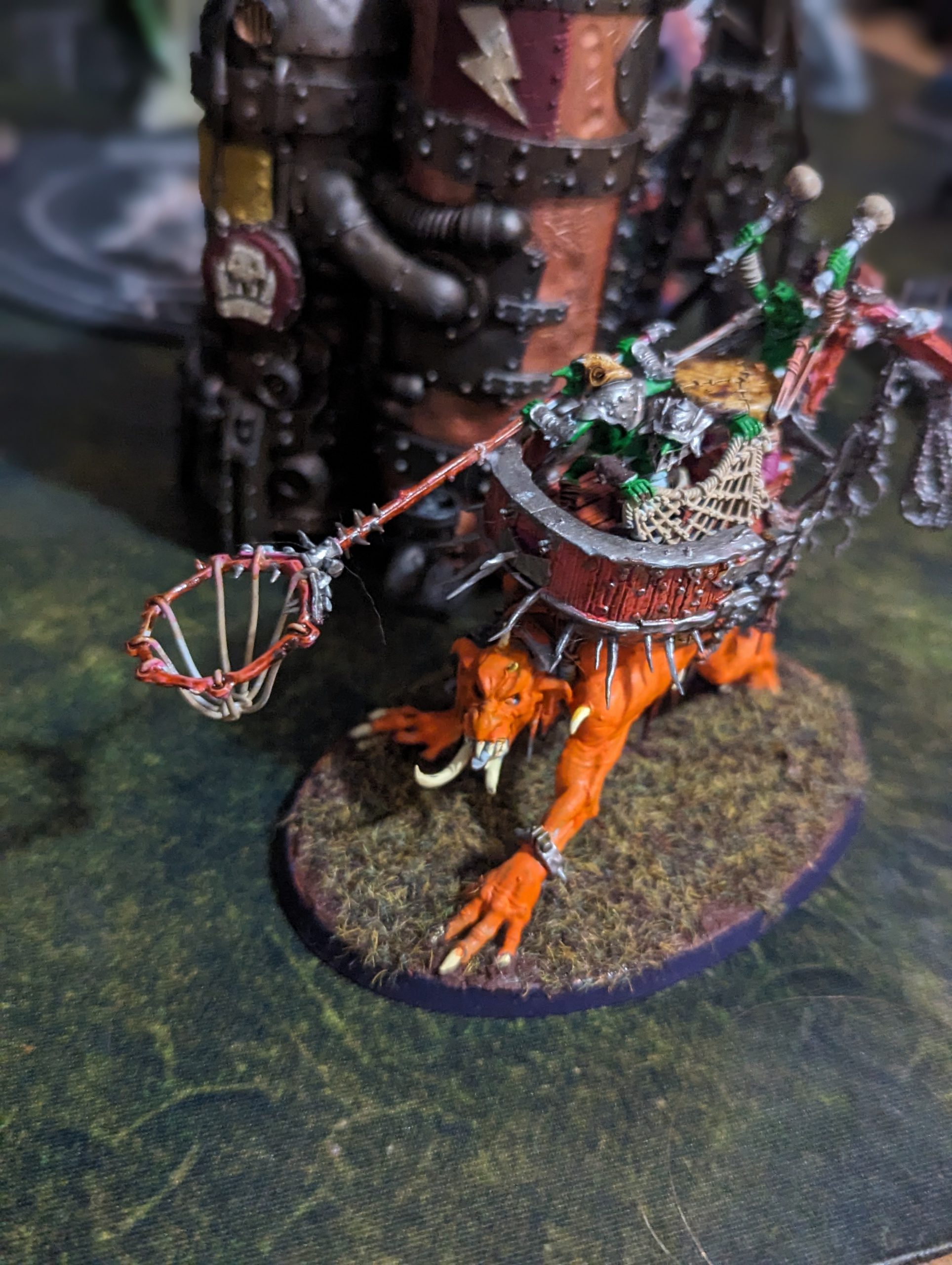 The Gitsnatchaz crew, known to their fellow orruks as "Da Biterz", were sitting in the howdah of their Marshcrawla Sloggoth. In this brief respite between raids, the grots aboard brainstormed what inventive things they could do with their next batch of captured foes. "Oi! We could eat em!" said Golmrog, his bark louder than his grumbling belly. The drummer, Rakk, had a more kunnin' idea: "We could hit em real hard, THEN eat em!" Porgo built on the ideas of his forebears with an even bolder, more kunnin, more brilliant plot: "We could hit em real hard, hit em again even 'arder, THEN eat em!"