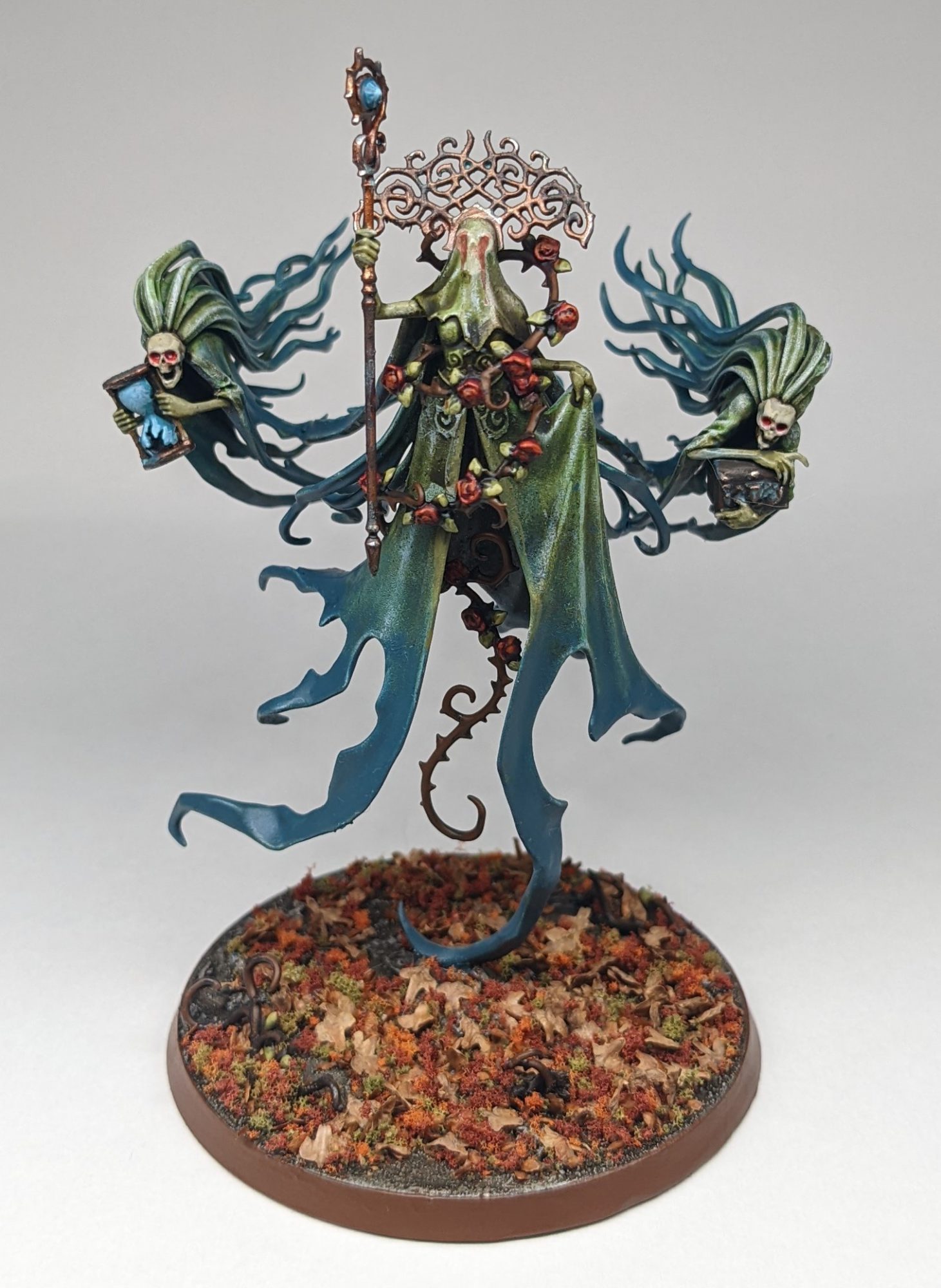 The Branchwych model dates back to 2016, part of the initial wave of Sylvaneth releases and clearly owing a lot to the Dryads that came before her. It's a simple model, being roughly a dozen varyingly spindly pieces, and with little in the way of extraneous detail. As a prototypical Sylvaneth foot hero, I think it's a lovely miniature. The included paint guide gets the job done, though I think they should have gone for something higher contrast with the Bittergrub on her shoulder. Here they have it in orange and burgundy against brown, which all looks rather muddy together. I'm thinking that the more limited nature of factions in