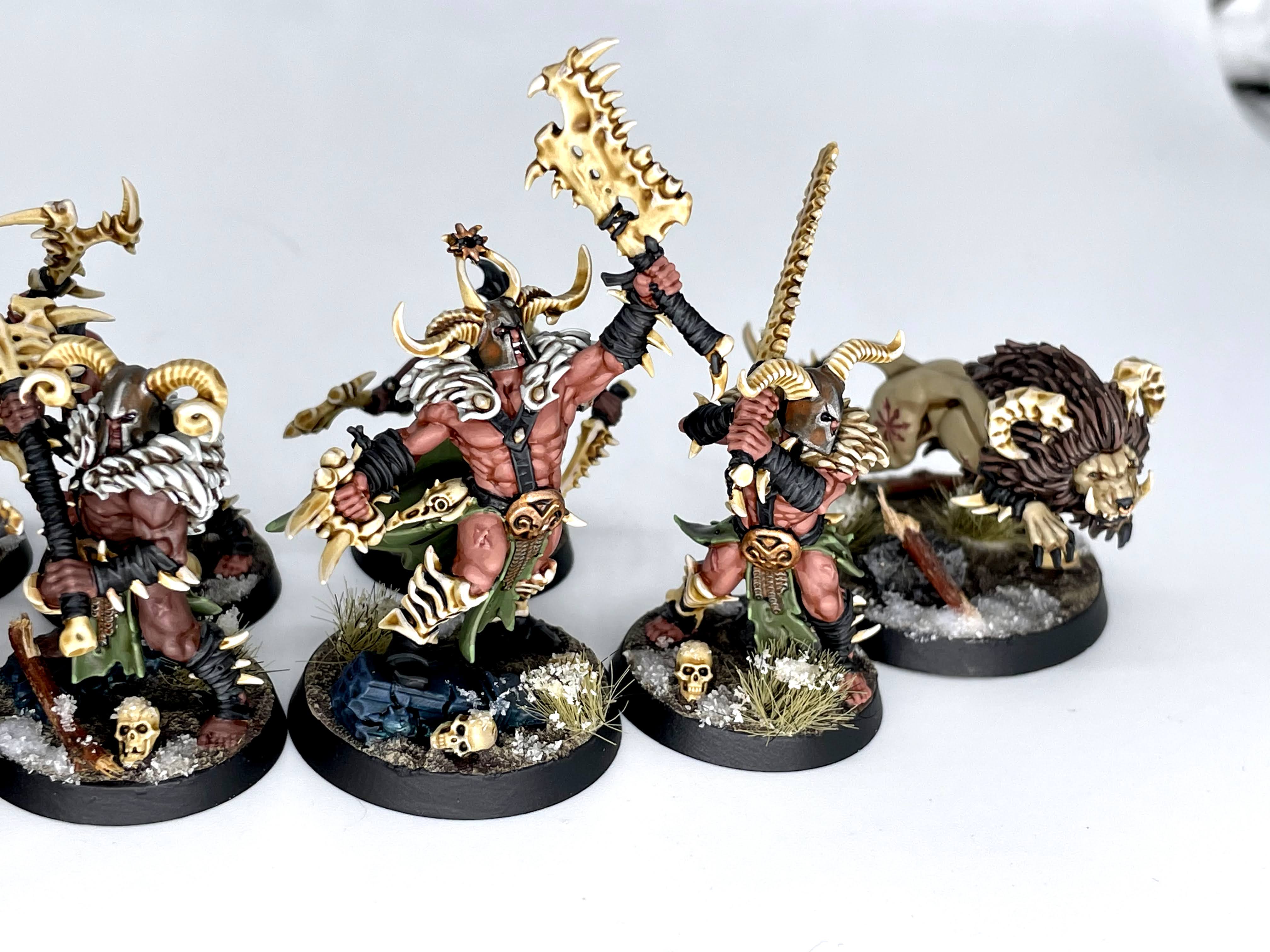 As for why I chose those two units of Untamed Beasts, I was stuck in a situation where I had exactly enough points leftover to take to one unit of cultists and leave a bunch of points on the table, or take a unit I liked and be 10-20 points over. I had built and primed both groups of 9 almost 2 years to the day of Adepticon, painting one and shoving the other into the back of my backlog. With a bit of the work already done, getting these guys ready to go was realistic, and they'd have some time-saving Contrast applied like the last regiment. The actual process of painting up these 9 dudes and dudettes was honestly pretty miserable, with the sheer amount of straps and bones jutting out of said straps being a real pain. There always seemed to be another detail I'd missed, and as my podcast cohost said in an