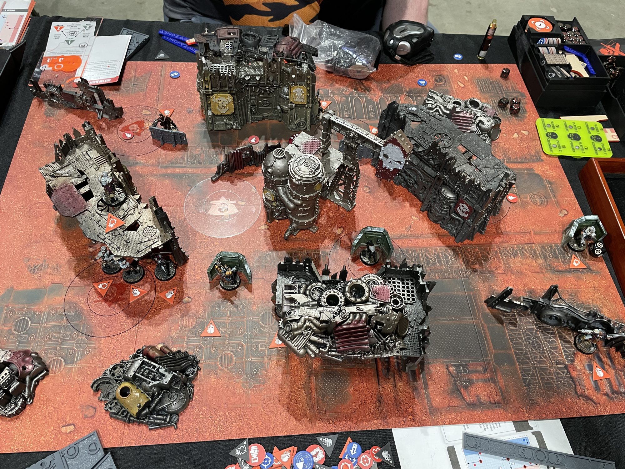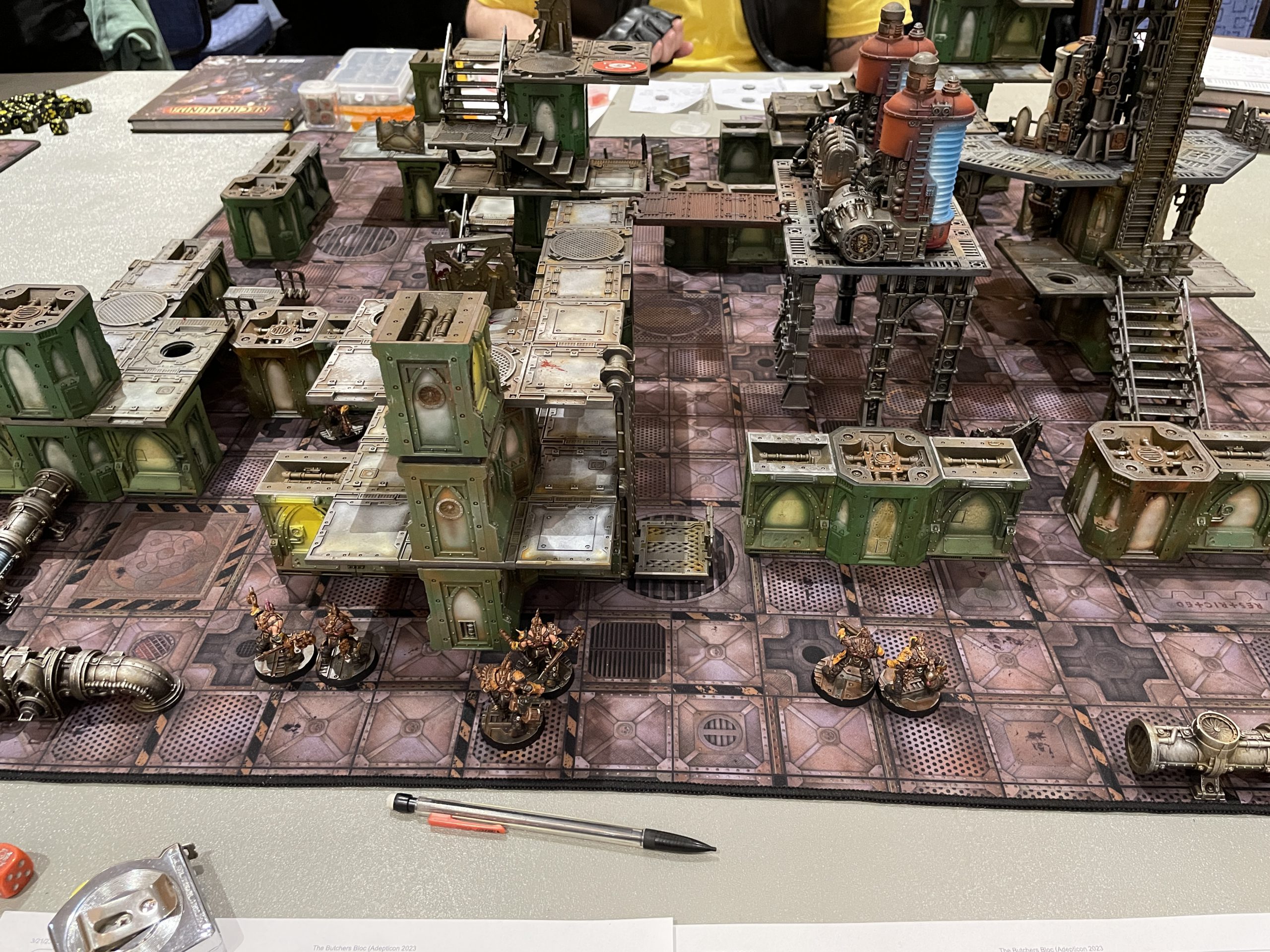 I woke up at 8am still drunk, something that hasn't happened since my early 20s. I don't recommend this experience. I dry heaved in the bathroom before my first game, and I had such a hard time getting out of bed that I didn't get breakfast or coffee beforehand. I felt insane. I got to my table, and was shuffled around as the AoS Team Tournament right next to us was having some problems with table placement. Imagine my consternation as, mid-deployment, a group of 4 people with their armies came up and said "actually this is our table" only for my non-confrontational and highly hung over ass to wordlessly shuffle away, army in hand, looking for any port where I could drop anchor. I winced every time the PA boomed with some garbled announcement about the AoS Team Tournament, loud enough that I could feel it in my molars. Somehow during this kerfuffle, I lost my baggie containing all my Kill Team and Necromunda accoutrements, but somehow extracted my dice and tape measure beforehand. Eventually, I settled into an unoccupied table near the back, some half hour after the round was meant to begin. I shook my opponent's hand, and thus began the first game of the day.