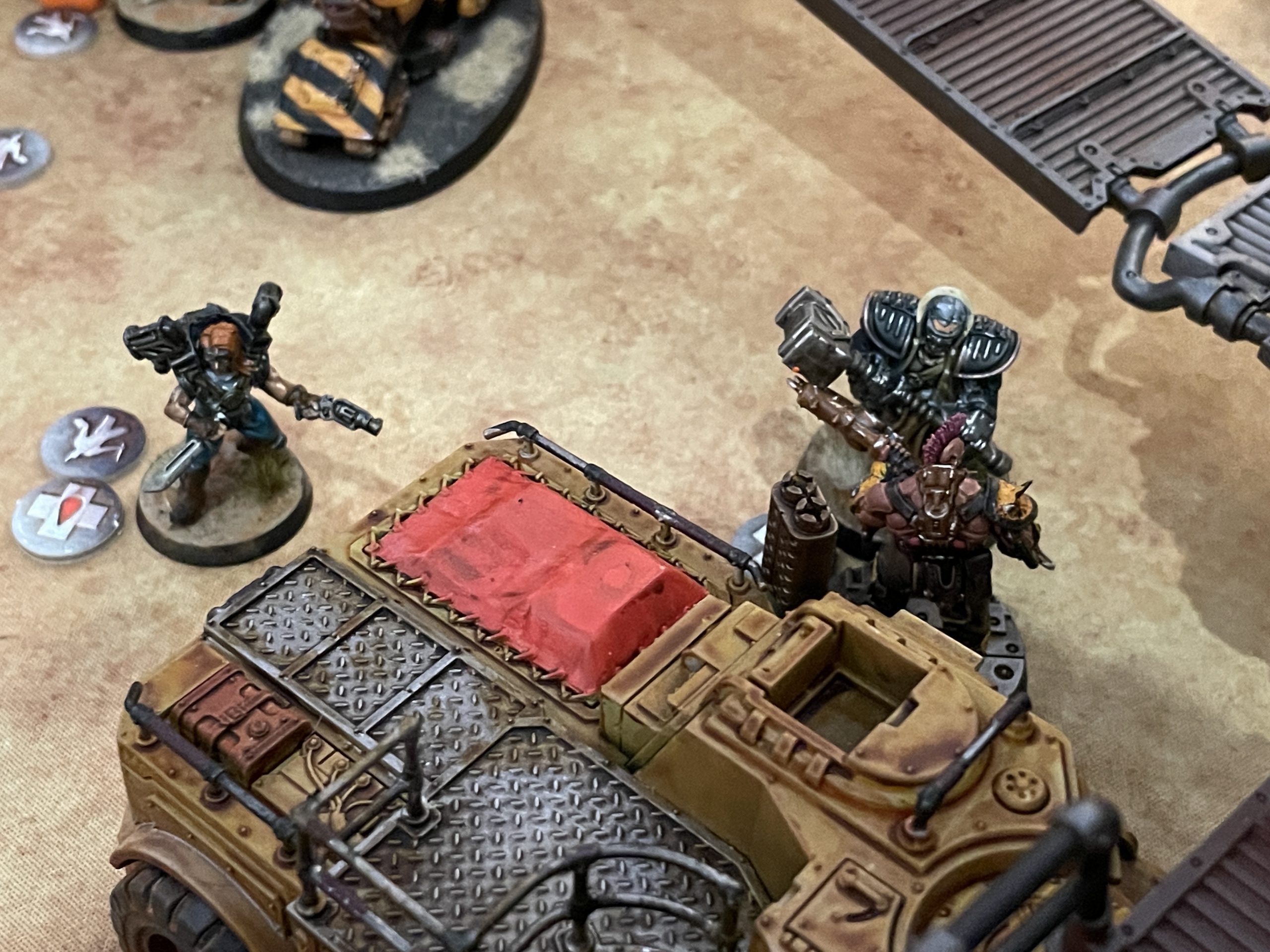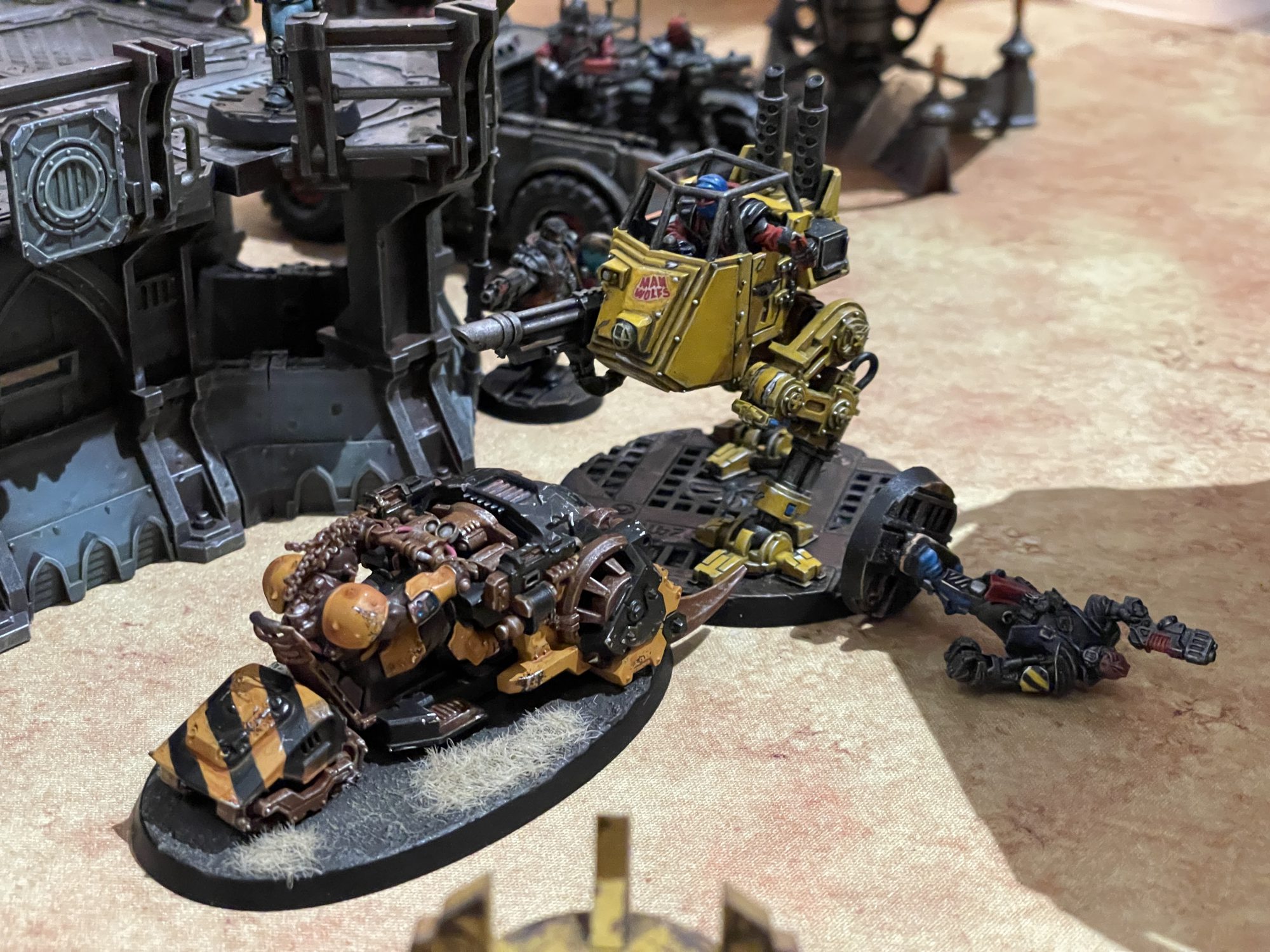 I reviewed last year. Said House Agent was merced by Ted Balloon, one of Fowler's jump pack equipped Wreckers, who was then heavy boltered into oblivion by Angus Thickburger. I was rolling better on the fuel checks, and once I'd secured 3 and Fowler had failed the roll on 1, I knew I'd secured victory. That didn't stop the Necromunda nonsense from continuing, however. Maul Rat rammed Fowler's walker, knocking off a fighter who was riding on top, who only narrowly rolled away as the vehicle lost control and ran into a wall. Maul Rat then rammed the walker again, knocking it off the table. The vehicle rules are wonderfully chaotic, and have filled me with so much excitement for all the wild and wonderful variables they add to an already wild and wonderful game. Fowler is also a great opponent, and just as invested in all the fun bullshit that Necromunda entails. I've been in Zoom and Discord painting hangouts with him for a good 3 years now, and it was great to not only meet him in person, but roll some dice and slam some hams together.