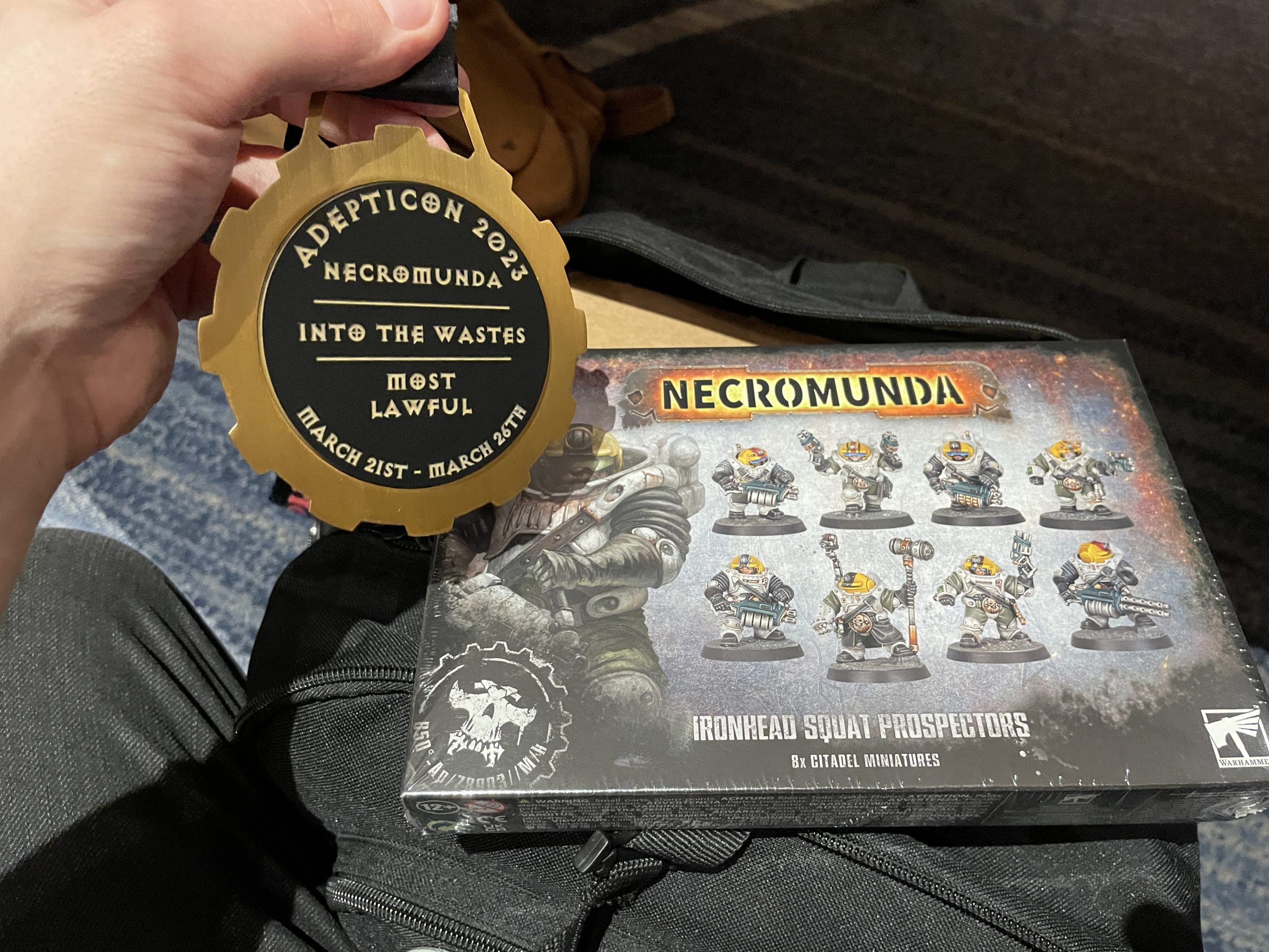 I regret to inform you, dear reader, that ACAB now includes me. I won Most Lawful for getting the best score on my team, which granted me a coveted Adepticon medal and my choice of reward from the prize pool. I grabbed a set of Squats, and now I'm waiting for the inevitable Ash Wastes upgrade kit for these little idiots. The event was immensely fun, owing largely to playing 3 games with 3 wonderful opponents who were all bringing the right energy and attitude to what may be Games Workshop's most unhinged game. The terrain was gorgeous, the gangs were characterful, and the vibes were immaculate. I think for events like this in the future, 3 games isn't really enough to take advantage of Necromunda's progression mechanics and economy, so it would be better to crank those numbers up or ignore them entirely. Having your fighters go into recovery is also a bummer in such a short event, and it was pretty telling when all fighters got to come out of recovery for round 3. As stated, I also couldn't figure out how the matchups worked, but was fortunate enough to be challenged by my friends for 2/3 of the rounds. I feel like skipping progression, giving us a slightly higher starting value, and determining matchups in a different manner would have helped. If it started earlier in the day we also could have stayed for the optional big battle at the end, but I appreciated the later start time. These are all nitpicks, and didn't get in the way of what was my favorite event of the con. Everything was run on time, everyone seemed to be having a great time, and I would absolutely play another event with this organizer.