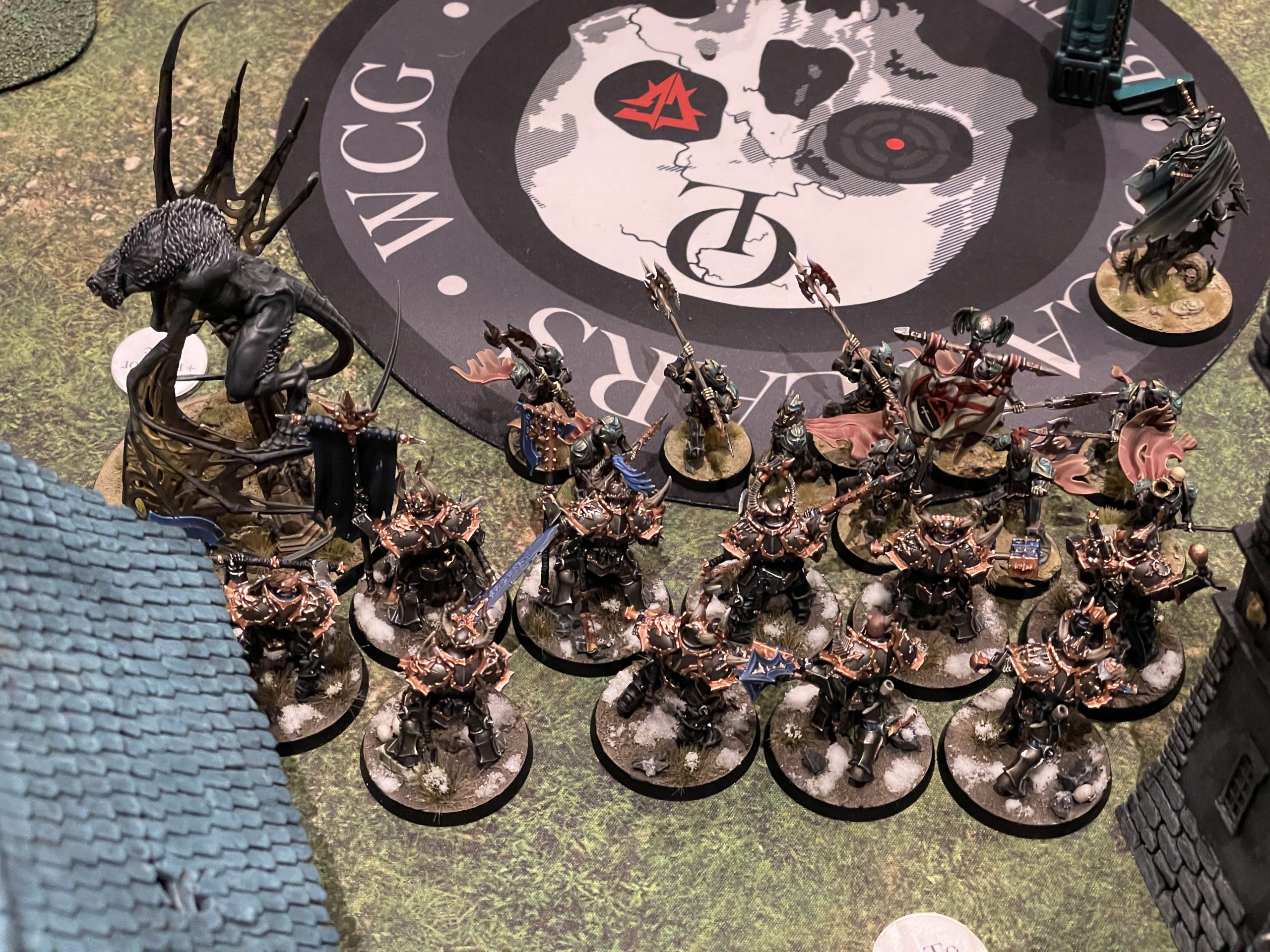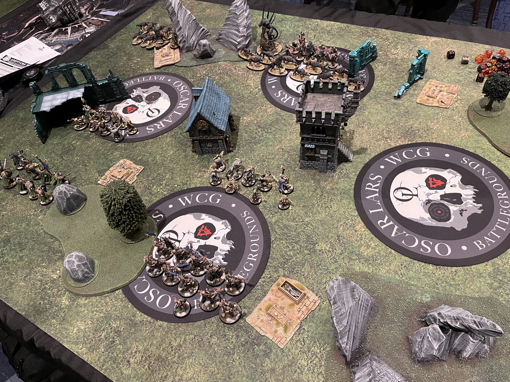 Badcast sticker and we got rolling. This game was, without exaggeration, one of the best games of Age of Sigmar I've ever played. After trading our screens, Oscar was able to lock down my Chosen with an extremely hard to kill monster and some Grave Guard. We danced around the backfield and flanks with his summoned dire wolves taking on my Warriors, and his summoned Grave Guard assassinated my Sorceror Lord. Meanwhile, my Chosen were chewing through his front line, and our armies were slowly sanding each other down. I had a turn 5 hail Mary, a 12" charge with my Warriors to take out his Vampire Lord and last 5 Grave Guard. I had to position my models