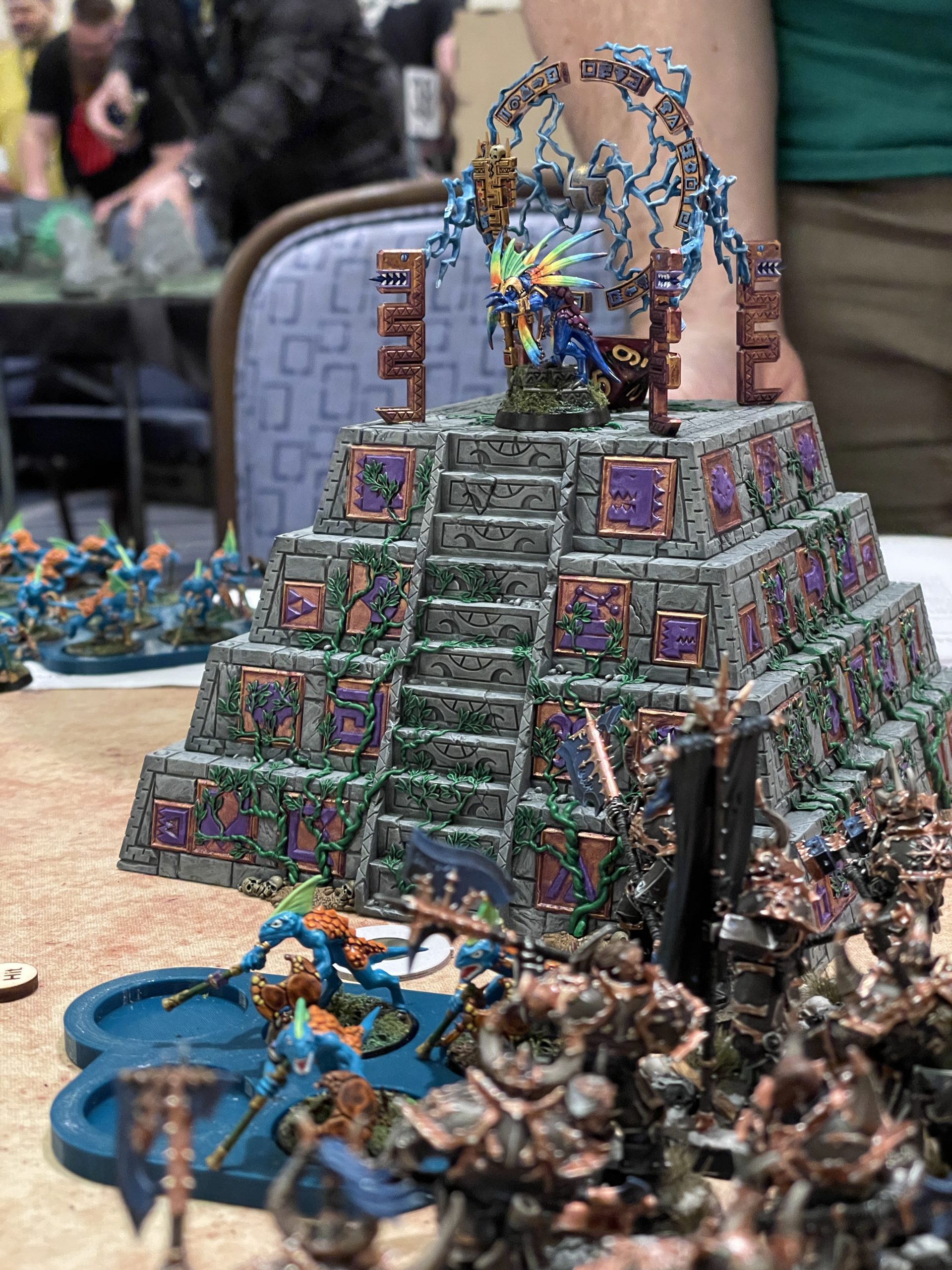 I won't bury the lede: My final game of the day was a blowout. Mark was more of a skirmish gamer who didn't play AoS all too often, and he was playing with an older battletome that left a lot to be desired. On the first turn he ran his Carnosaur and cavalry up, charged into my screening Untamed Beasts, and was then wide open for my Warriors to countercharge his cavalry and my Chosen to yeet themselves 12" and charge into his his Carnosaur. I cast a Fights Last spell on the cavalry, and took out both units before my turn was up. My Chosen continued onwards, plowing through his mob of skinks and taking only a handful of wounds in exchange. I wasn't going to play the game for him, but I was kinda shocked that he didn't Unleash Hell when I charged his mob of 20 blowgun skinks. It unfortunately wasn't much of a game, and while he did Dinosaur Laser my second unit of Untamed Beasts away, the biggest boon he got was when my Sorceror Lord channeled Chaos too hard and exploded his own head, dying on turn 2. Play Chaos games, win Chaos prizes. The game was a 20-2 victory for me, and we sat down and talked tactics afterwards. We talked through some general tactics, army composition, and order usage, and I hope to see him keep playing AoS.