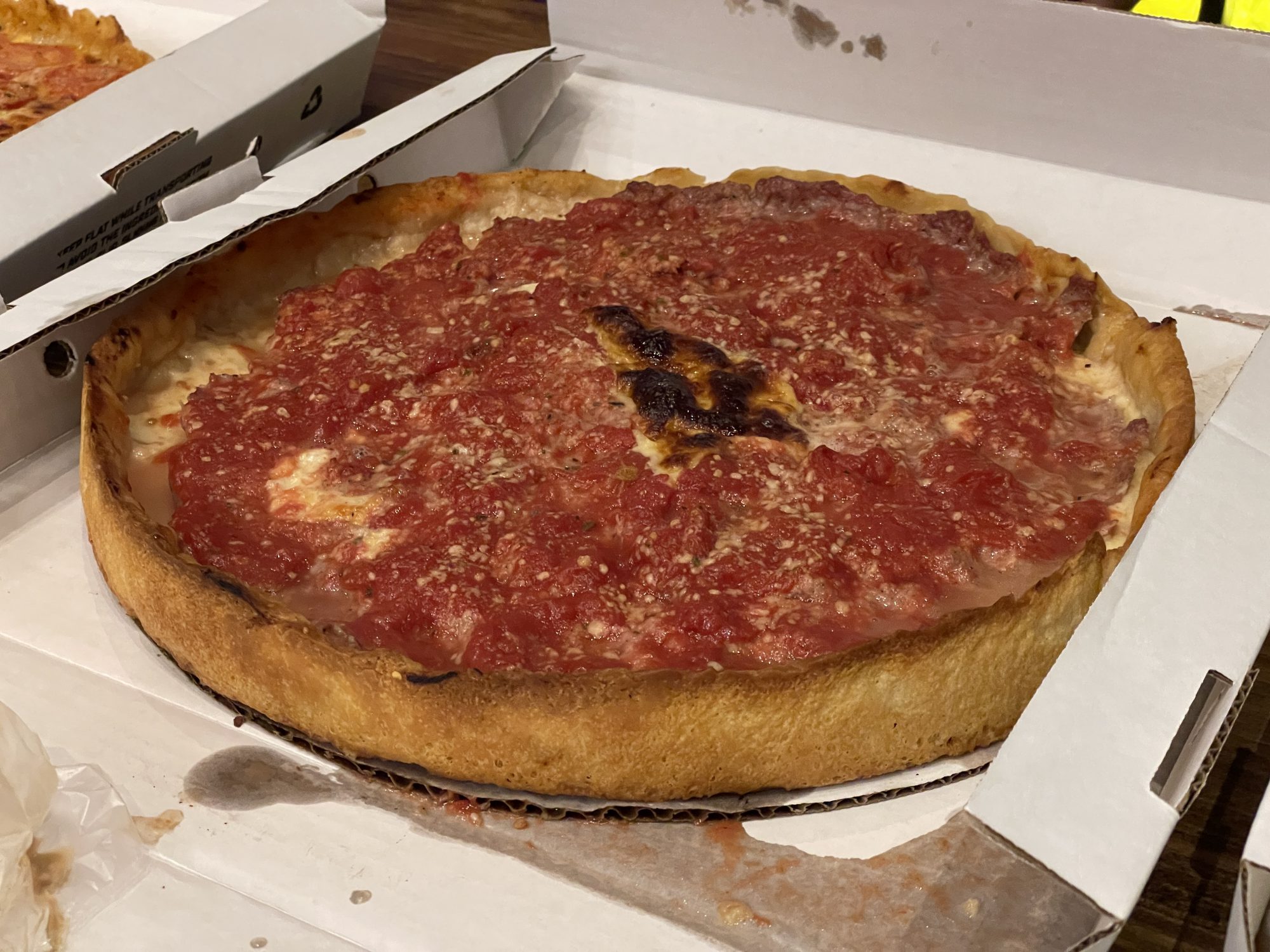 The pizza finally arrived and it was, in no uncertain terms, transcendent. While opinions may differ on who does it best, Lou Malnati's is to date the best Chicago-style pizza I've had, and Craig invited me to heft the stack of 3 pies he'd ordered. By my estimation it was 15lbs of bread, cheese, sauce, and more besides. We had to fetch a knife from the restaurant, as their pizzas arrive uncut, and got to digging in. This was basically the first thing of substance I'd had all day, and I greedily had a slice each of the pepperoni, sausage, and veggie varietals. I enjoyed these with a Revolution