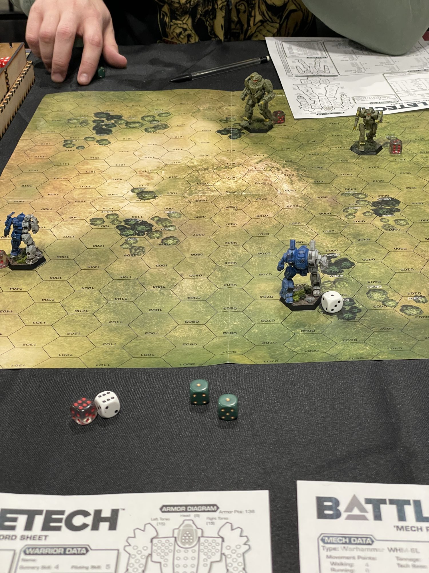 I took a Blackjack and a Warhammer this round, as those mechs are familiar to me. You may notice that my mechs are a Griffon and Archer, but we were invited to use our own models, proxy things in, or use the event models, and I wanted to show off my work. As far as I recall, Mark took the same. Immediately things went well for me, as I was nailing PPC shot after PPC shot from my Warhammer into his. Without talking to me, Mark grabbed my dice and said he wanted to check that I wasn't cheating. He rolled them a few times, and, satisfied that my dice weren't loaded, said he was just joking. I knew he was lying. This hung a pall over the entire game, as did his generally sour attitude whenever he missed a shot, which was quite often. He would loudly curse and switch dice, time and again, and he held onto a pair of my dice for the entire game without my consent. I flanked his Warhammer with my Blackjack and destroyed it, only for his Blackjack to take mine out in vengeance. He managed to do a bit of damage to my Warhammer as well, which meant he narrowly beat me out on points. I maintained a chipper attitude the whole time, as I was here to roll dice and have fun, and he had an awfully bad attitude for someone who had just won a game. If you could not tell, he was one of the grumpy grognards I clocked from the beginning.
