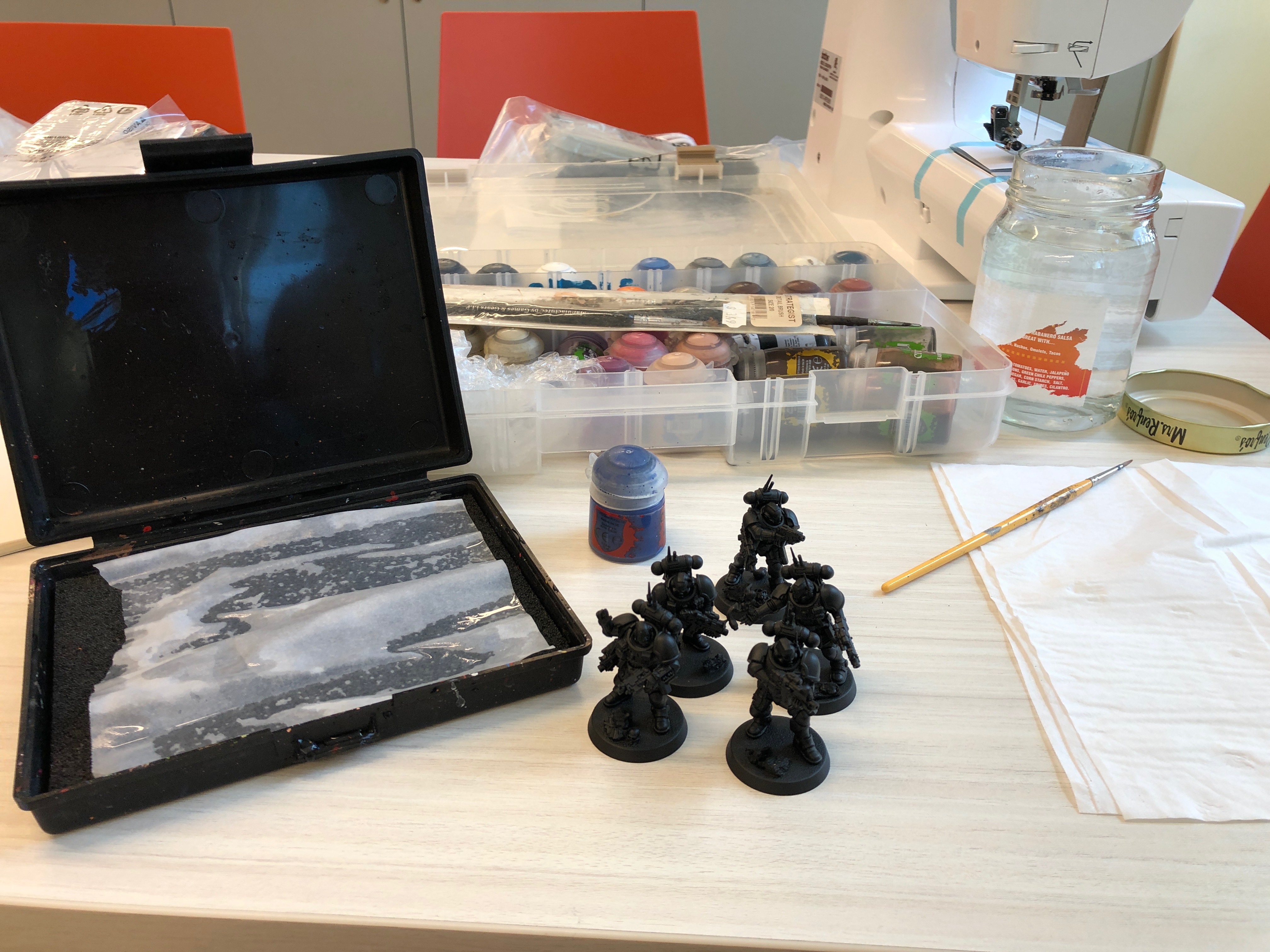 Fortunately I have access to a great public library to work and paint out of, but getting everything set up to paint can be a bit of a problem. It means finding an empty table in the maker space, doing the legwork to get water, tissues, and so on for painting, and unpacking my paint kit.