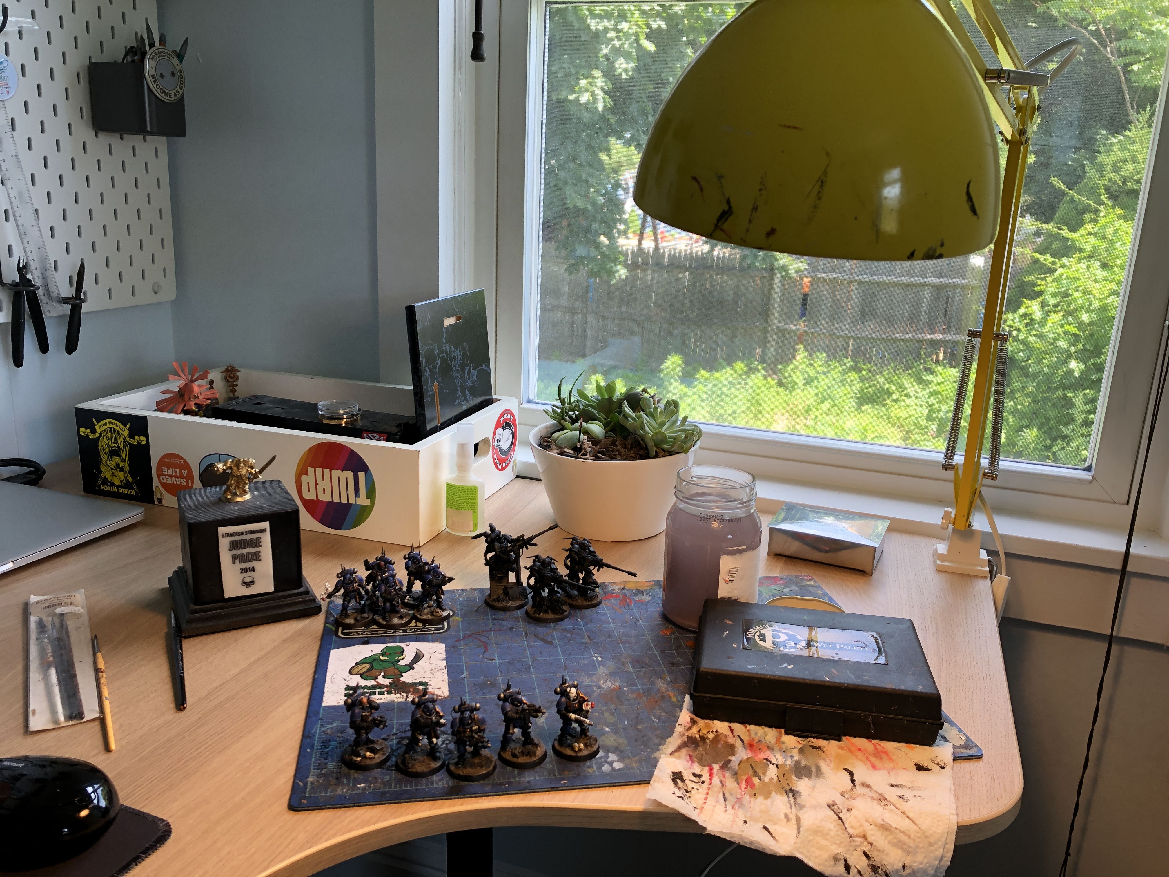 While there's still more to do, I can finally paint at home comfortably again. No more library painting for this fella! I even got to play with some Contrast paints, which I tested on the vials and smoke of these two Infiltrators: