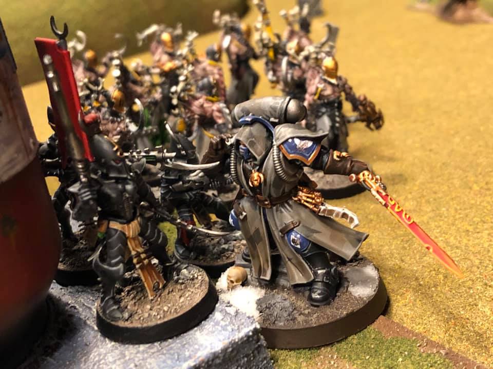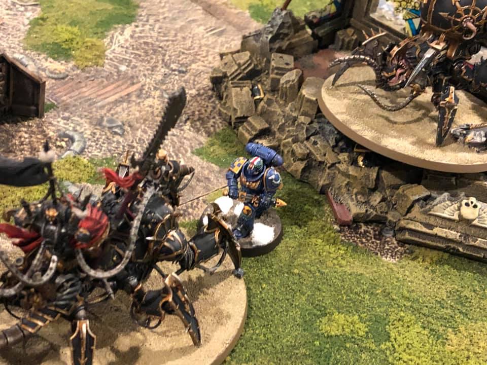 He outflanked with his Mandrakes, drove up the left flank with a raider full of an Archon and his Incubi, and charged up the middle with his Wracks. I secretly had a squad of Intercessors in the Valkyrie (so secret, Dylan told it to me on turn 3 and no sooner) who were able to jump out and help me get a full on feelbad surround on his Incubi Raider, destroying it and preventing escape for like a third of his army. I can't say I like that rule but it was my only way out in this battle against a shrewd opponent. While that happened, I had to start diverting my force towards the Wracks and Mandrakes who were closing in on the VIPs.