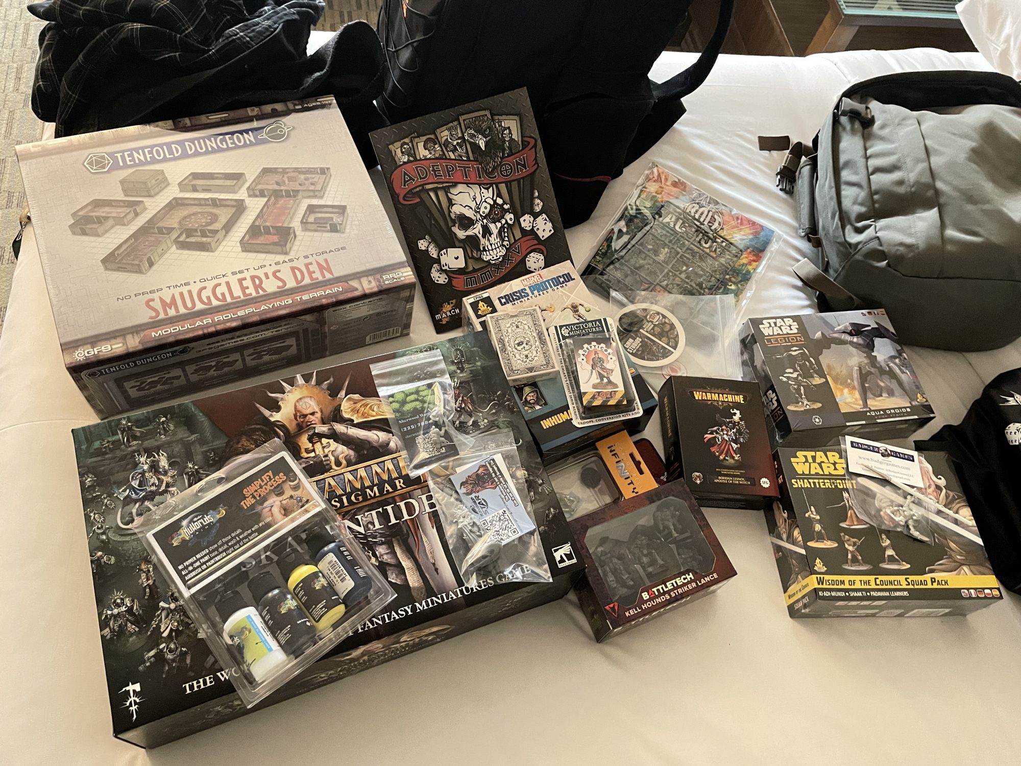 It was time to gather my swag bag and for my buds to attend some early painting class, so we headed back to the convention center. I ran into Tuomas Pirinen for all of ten seconds, unmistakable as the only well-dressed attendee of the entire con. I don't think I saw him moving less than 60mph for the entirety of the event. Swag bag in hand, I headed back to the room and dumped off everything you see before you. Of this, maybe six miniatures would come home, the rest being given away to friends, strangers, and former strangers who I now count as friends.